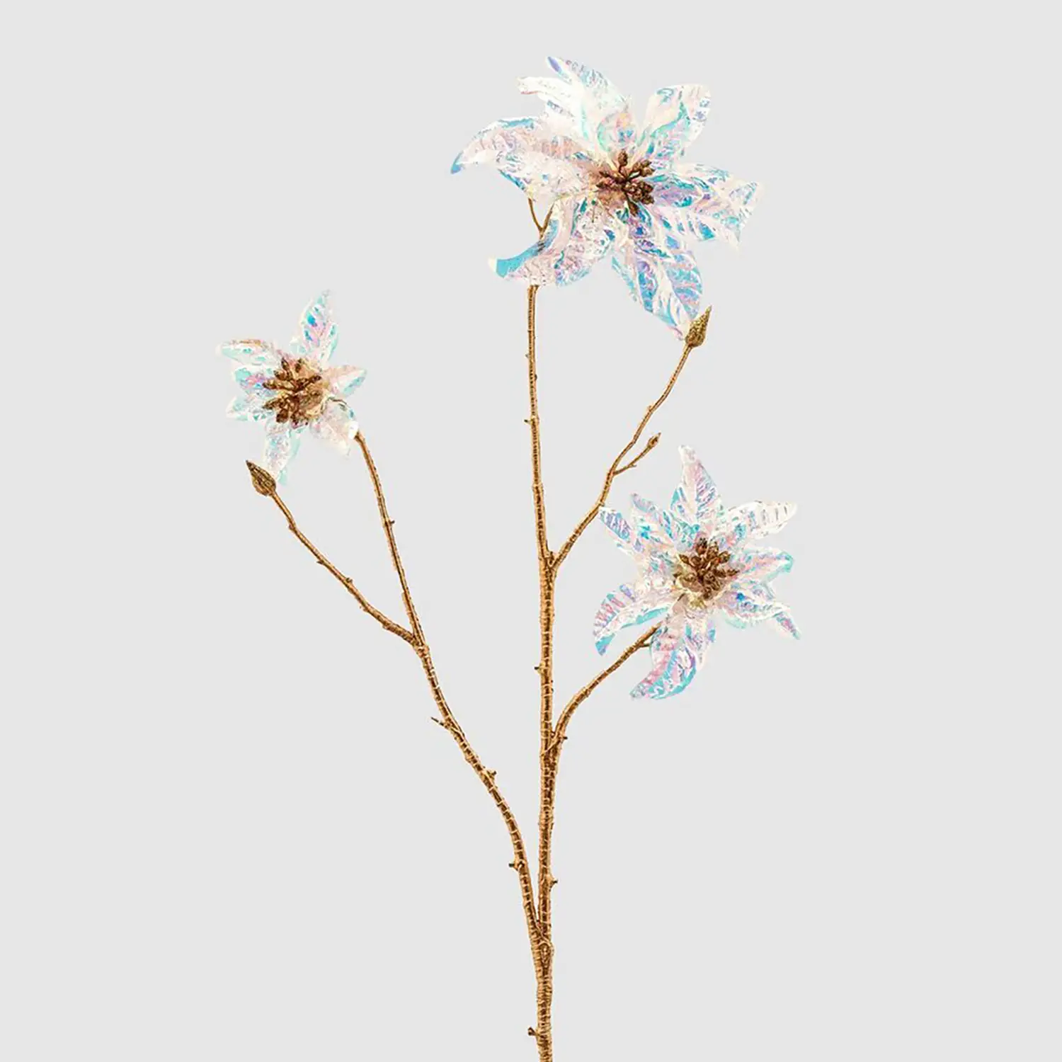 Un tocco raffinato per il tuo Natale La Stella di Natale Rex Reflex EDG è una decorazione elegante e luminosa, perfetta per impreziosire alberi, ghirlande e composizioni natalizie. Con i suoi tre fiori iridescenti montati su uno stelo dorato, porta in casa un effetto scintillante e sofisticato.