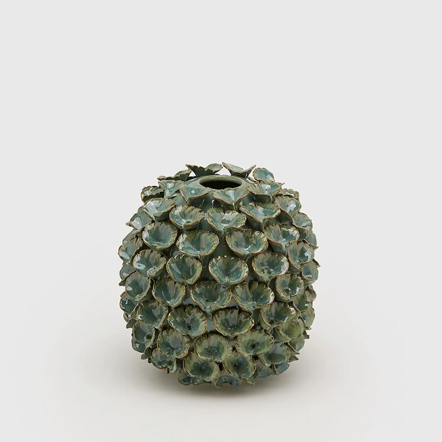 Vaso EDG Chakra Foglie Ninfea Raffinato vaso decorativo EDG con lavorazione a foglie ninfea in rilievo. Il design tridimensionale e la finitura verde sfumata donano un elegante effetto naturale, perfetto per ambienti moderni, botanical e contemporanei.