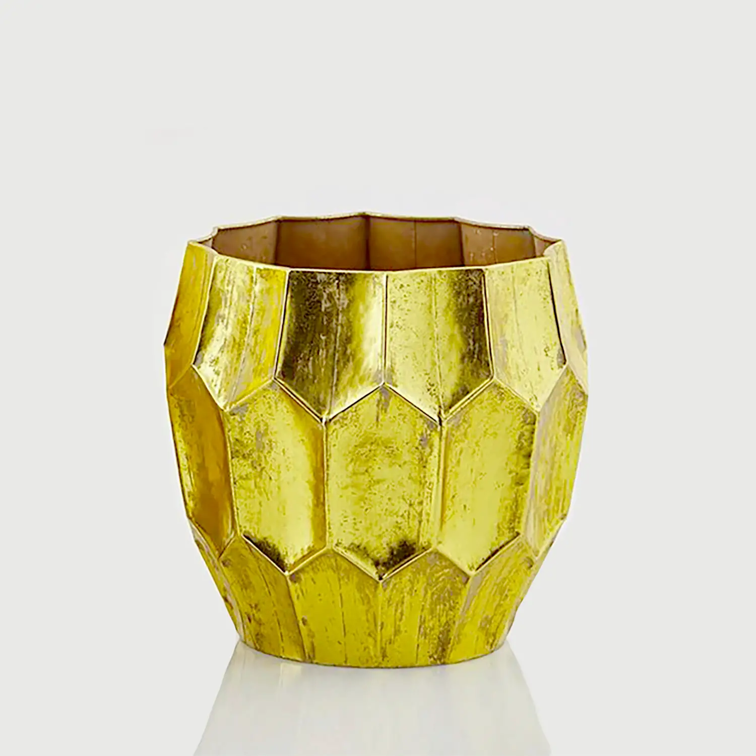 Stile contemporaneo questo vaso metallo EDG in finitura oro con texture geometrica è perfetto per arredamenti moderni e raffinati.