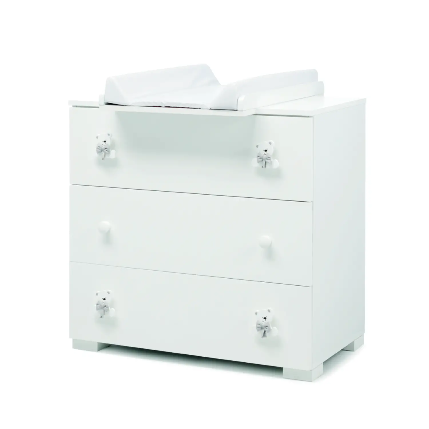 Ogni cassetto è impreziosito da due pomelli a forma di palina e due a forma di orsetto, decorati con fiocchi morbidi ed eleganti, che richiamano il tema simboli della collezione Tato.