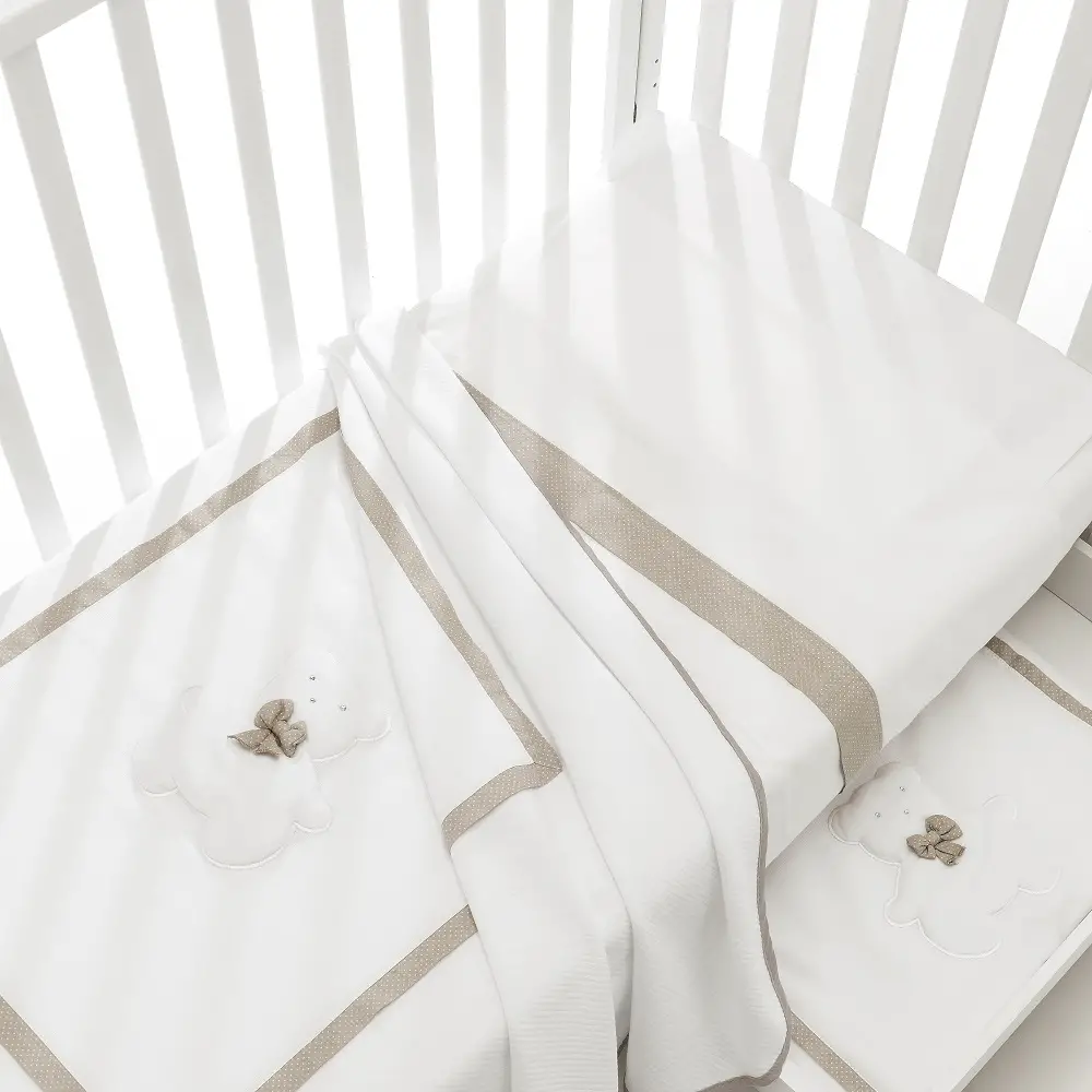 Il Lenzuolino Dudu Bianco Ricamo Tortora Erbesi è un set 3 pezzi elegante e confortevole per il lettino del tuo bambino. Arricchito da ricami delicati e fiocchi raffinati, è perfetto per le collezioni Dudu e Fiocco, ma si adatta anche a lettini a sbarre di altre marche.