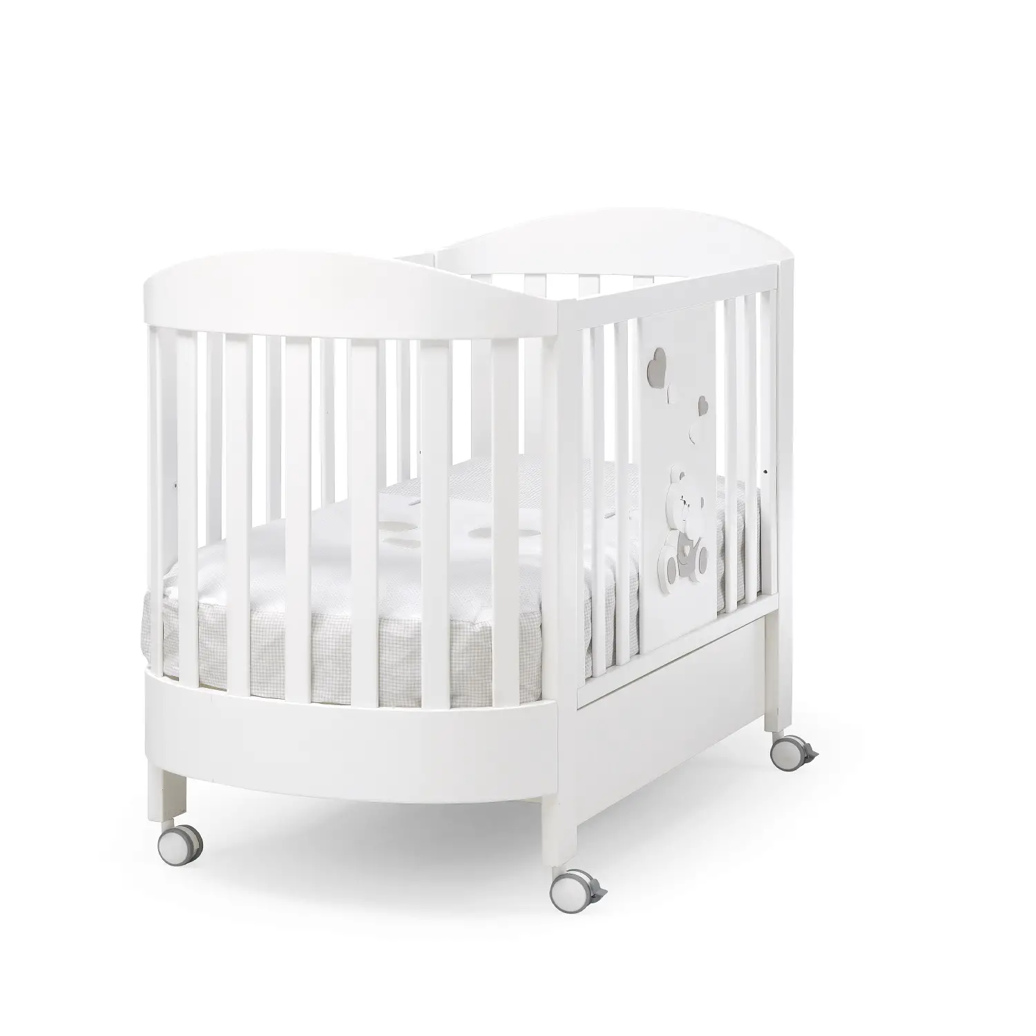 Elegance and refinement are encapsulated in the special curved shape of the headboard and footboard, which require great woodworking that creates a baby bed with a very modern style. Practicality and comfort are ensured by the double height of the bed base that can be used in the first months at the upper level, the movable side rails that also allow the baby to climb in and out on his own, and the practical dresser for storing favorite clothes.