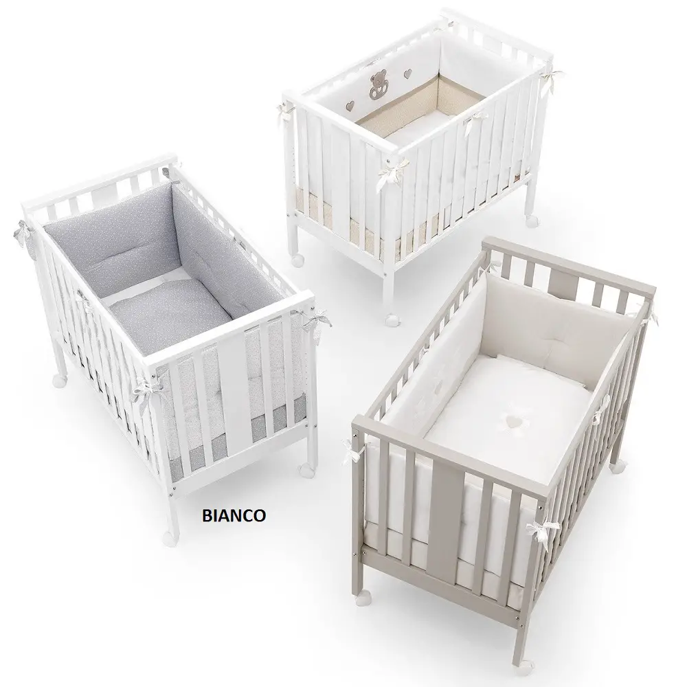Mini lettino bianco senza applicazione, dotato di due cinghie di sicurezza per l’ancoraggio al letto matrimoniale e di 4 ruote piroettanti di cui 2 con freno.