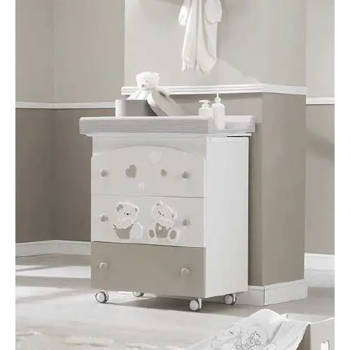 La collezione Erbesi Mirtillo si caratterizza per uno stile semplice ed elegante, ideale in qualsiasi ambiente ed impreziosita dalle applicazioni dei teneri orsetti, nei colori del bianco e tortora, in compagnia del loro amico coniglietto. Le applicazioni sono presenti anche sul primo cassetto del bagnetto fasciatoio. Gli arredi Erbesi sono realizzati con ottimi e pregiati materiali per durare nel tempo e arredare la camera con eleganza e stile.