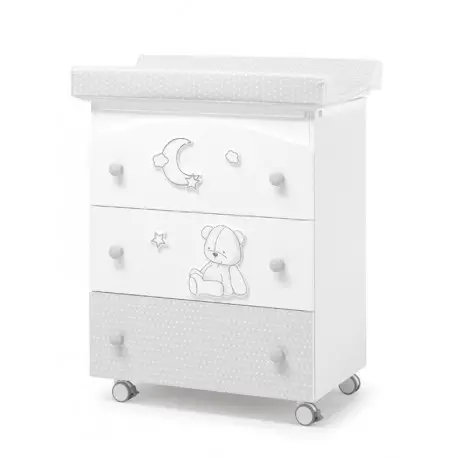 Il bagnetto Stella Magic di Erbesi offre un design elegante e funzionale, con tre cassetti capienti e una struttura robusta in truciolare certificato E1 a bassa emissione di formaldeide, rivestito in PVC.