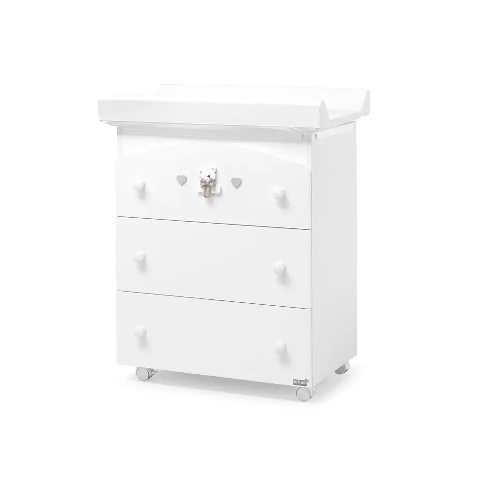 • Cassettiera a 3 cassetti: Ampi e capienti, con pomelli a forma di palina e orsetto, arricchiti da fiocchi morbidi color tortora.