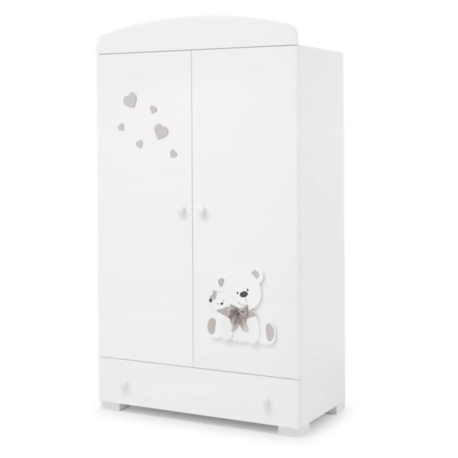 Dotato di due ante e un ampio cassetto inferiore, permette di organizzare con ordine vestiti, biancheria, accessori e tutto il necessario per il neonato.