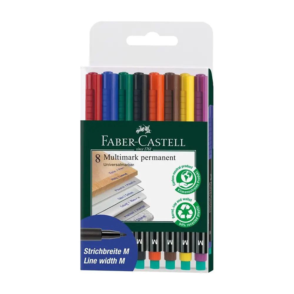 - ✅ Pennarelli Multimark Faber-Castell con punta media da 1 mm per tratti precisi e visibili su superfici lisce.
