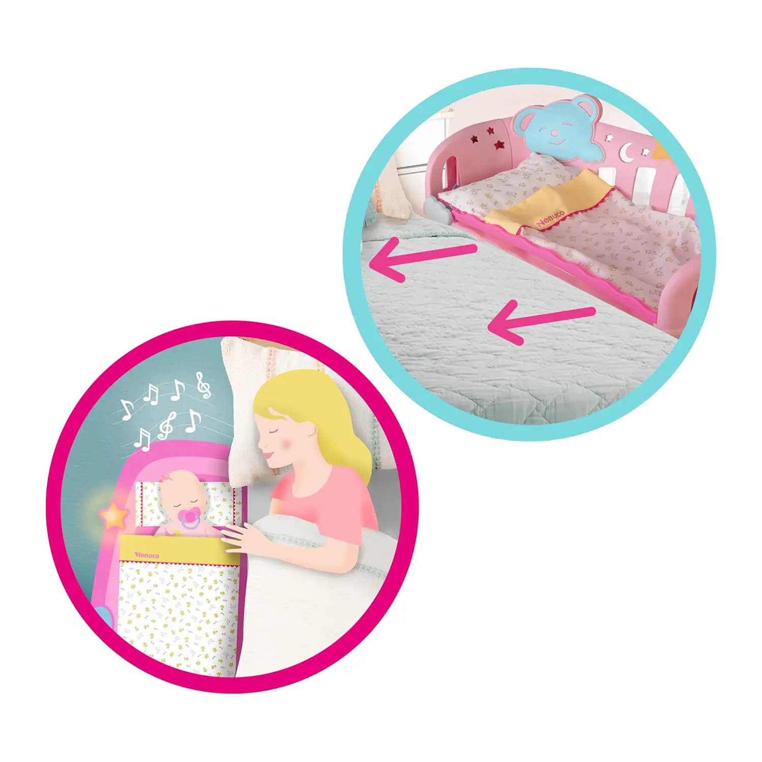 Culla 3 in 1 universale La culla si aggancia facilmente a qualsiasi tipo di letto, permettendo di tenere Nenuco vicino durante la nanna o il gioco. Funzionale e versatile, accompagna i bambini in molteplici attività quotidiane.