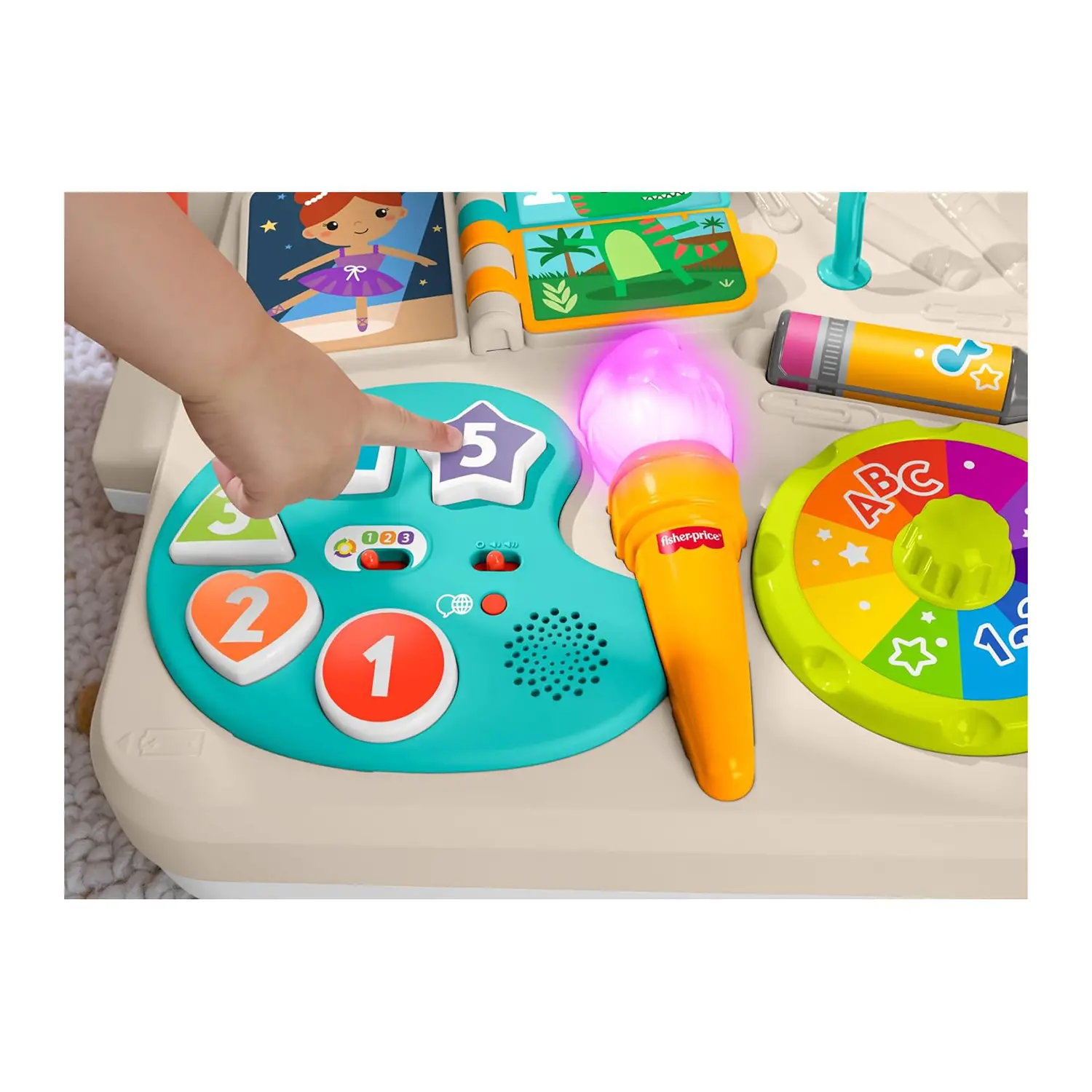 Tasti colorati, ruota dei colori, barra ad anelli, rullo a forma di matita e levetta dei numeri rendono il gioco un’esperienza multisensoriale. Luci e suoni si attivano con ogni azione, favorendo l’interazione e la scoperta attraverso il gioco.