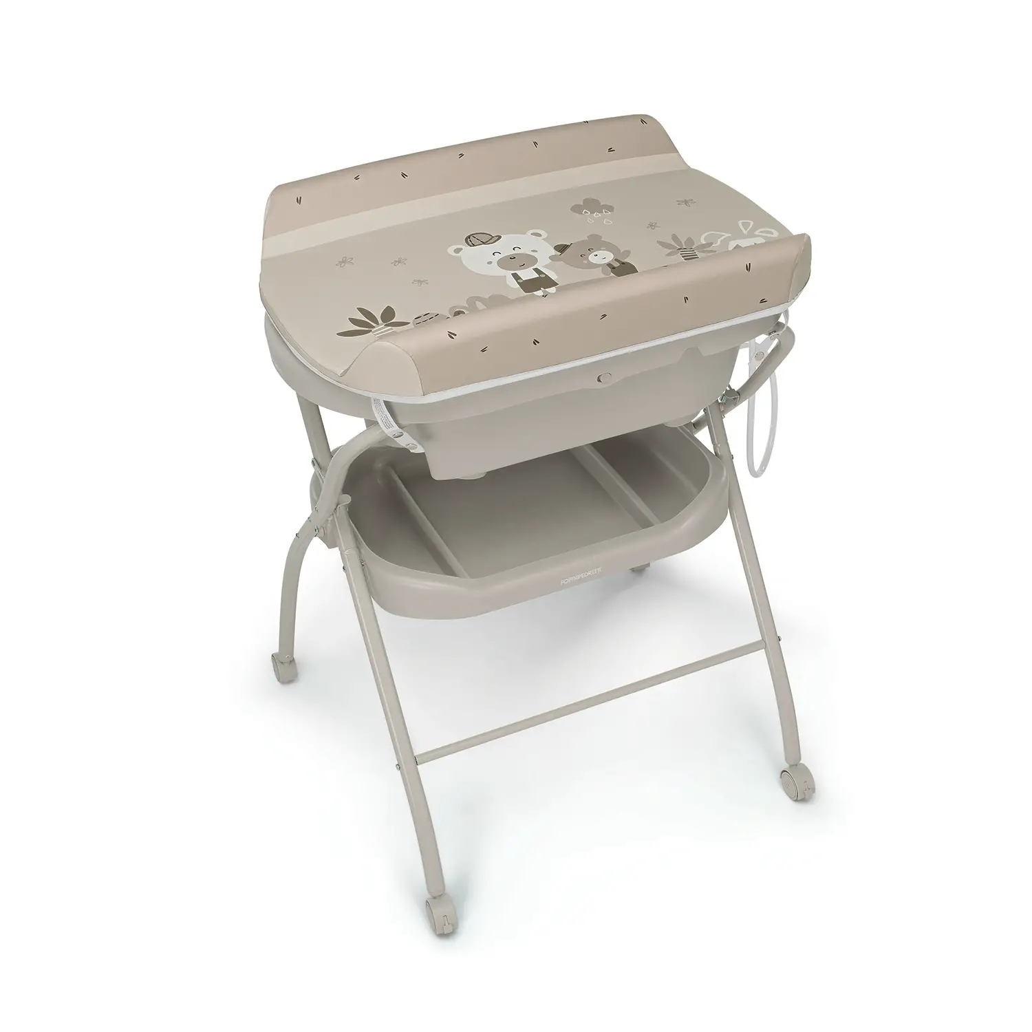 Pratico e facile da spostare Dotato di 4 ruote piroettanti con freno, il bagnetto fasciatoio è facilmente manovrabile all’interno della casa. I vani portaoggetti integrati consentono di tenere a portata di mano detergenti, spugne e accessori per il bagno del bambino.
