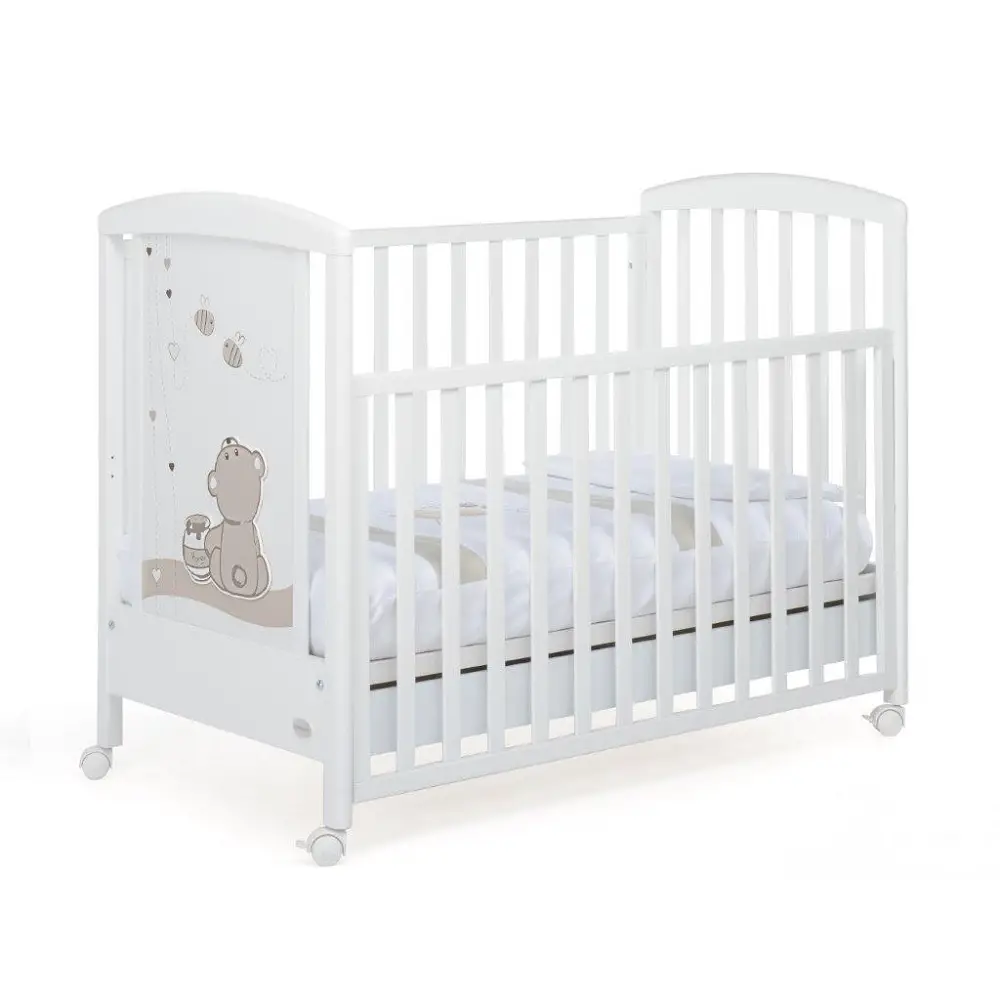 Anche la rete è regolabile a due altezze, per consentire un pratico uso anche quando il bimbo è neonato. Una delle testate del lettino ha decorazioni con un simpatico orsetto con il suo vasetto di miele, per un’eleganza senza tempo.