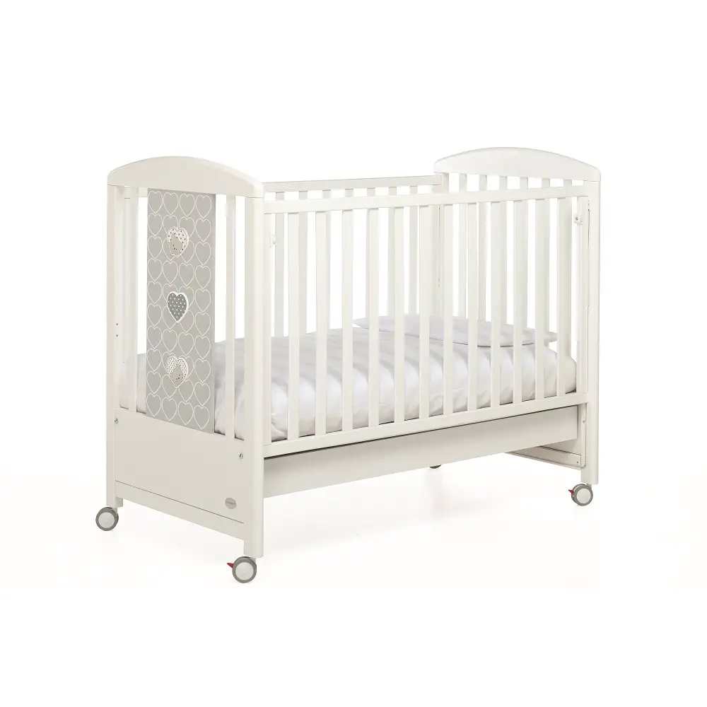 Crib with adjustable and retractable side rail, convertible into a sofa.