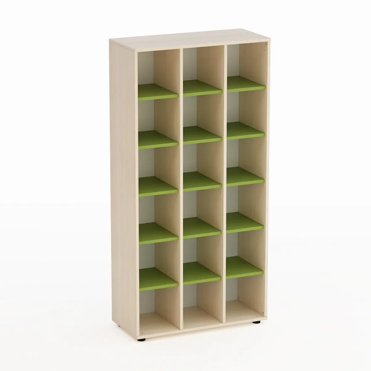 • Design Colorato: Struttura Betulla Mainau con 18 caselle in colori vivaci (Verde Kiwi, Verde Kiwi, Verde Kiwi, Bianco Magnolia) e schienali grigio cielo utilizzabili come divisori.