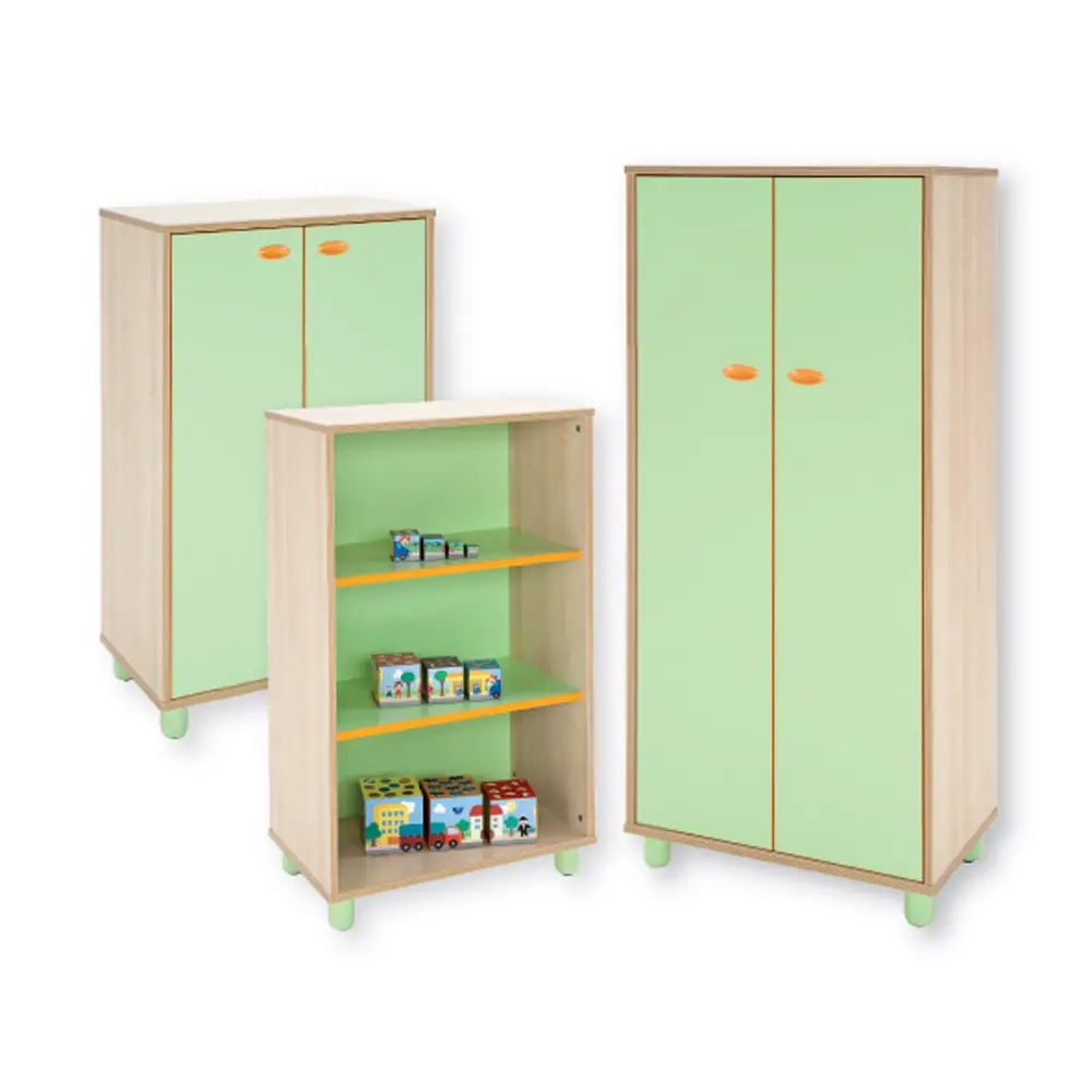 - M021.70 – Mobile con ante altezza cm 119, colore verde: include ante colorate, ripiani, maniglie ad incasso, finitura acero + bordi a contrasto, schienali colorati. Prodotto già montato.