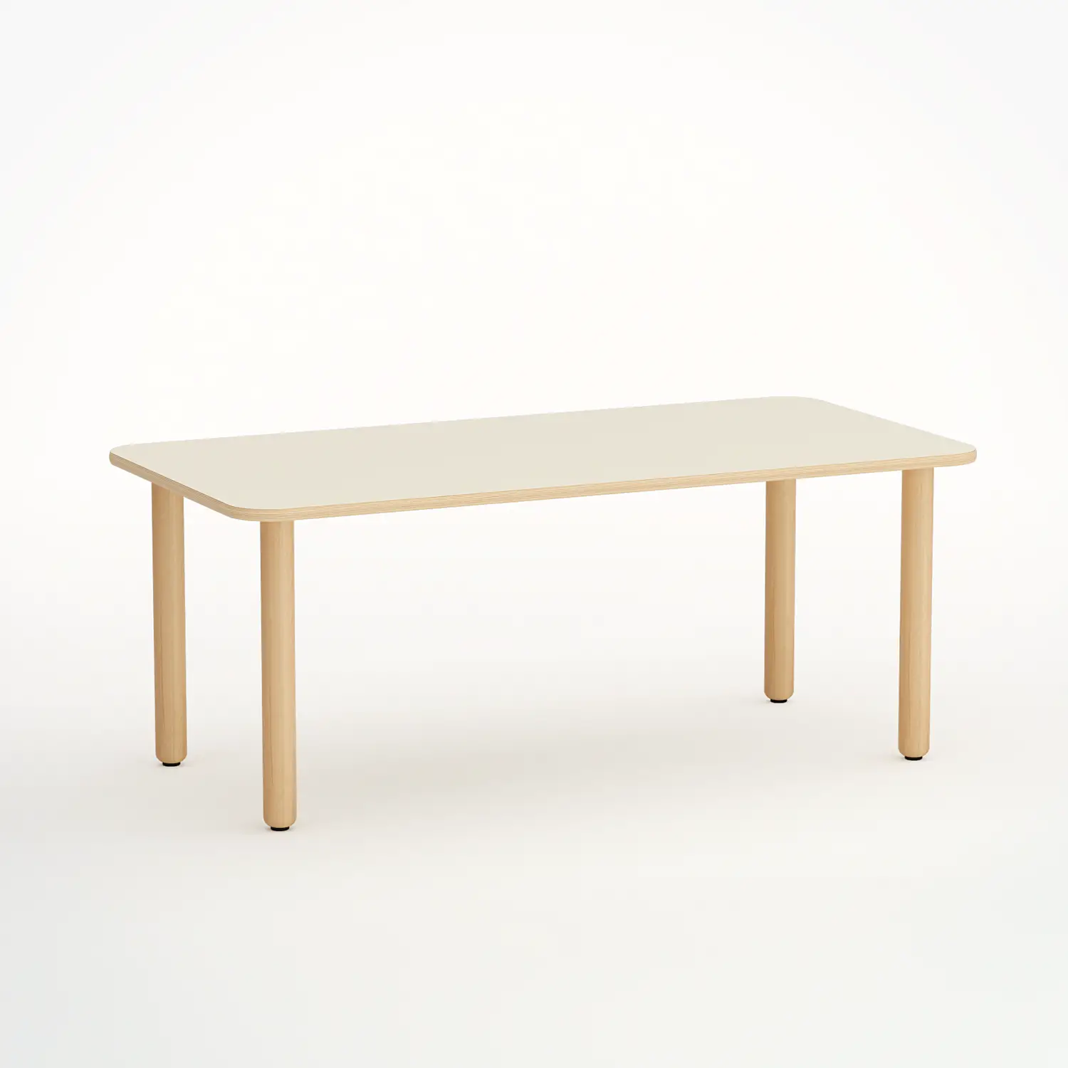 Bordo arrotondato con vernice trasparente atossica. Gambe in faggio massello ø 60 mm, verniciate al naturale, garantiscono stabilità e sicurezza.