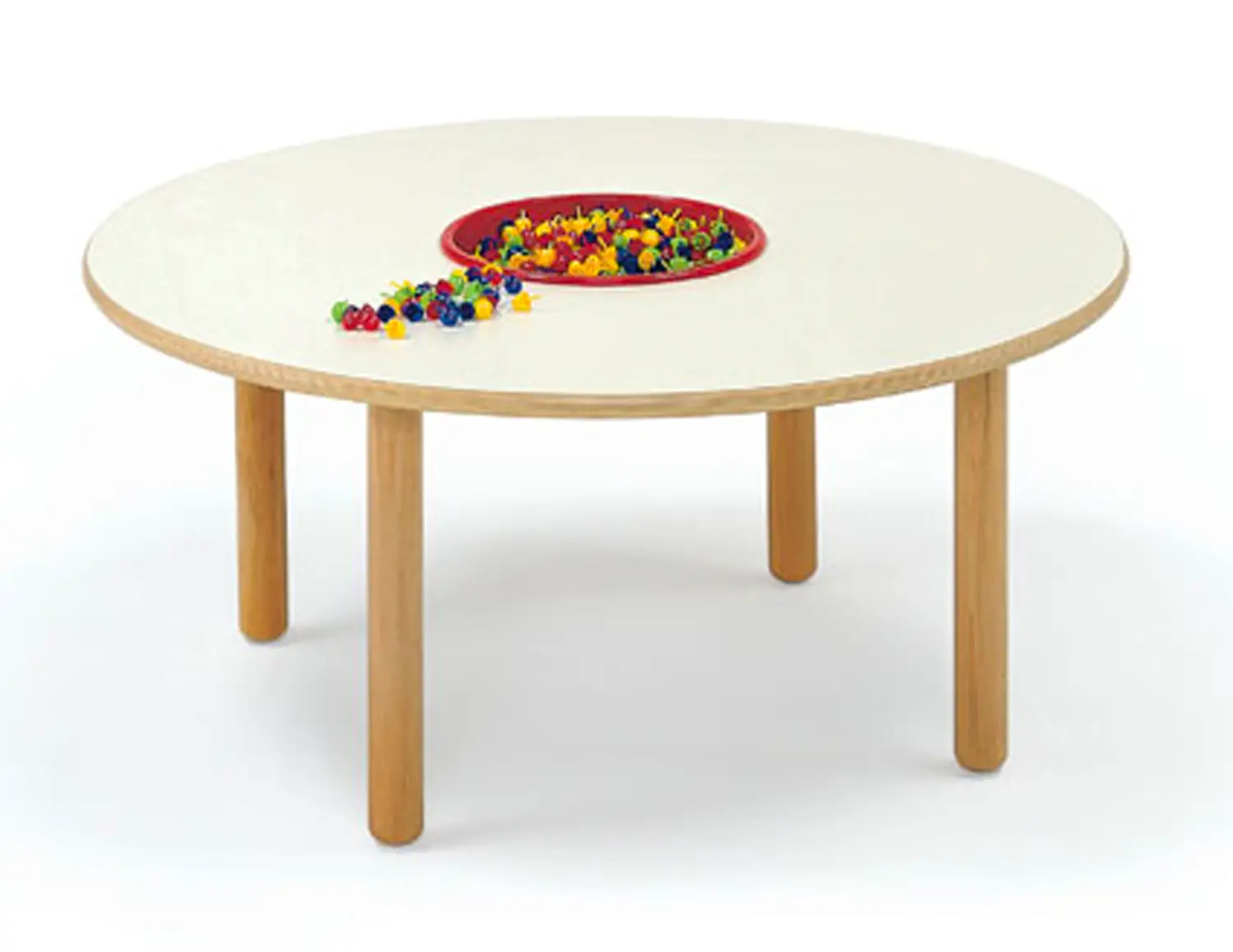 The plastic container integrated into the Round Manipulation Table Cm. 120 Size 1 for Infant-toddler Centers GIODIARREDA facilitates access to games and materials during group activities.