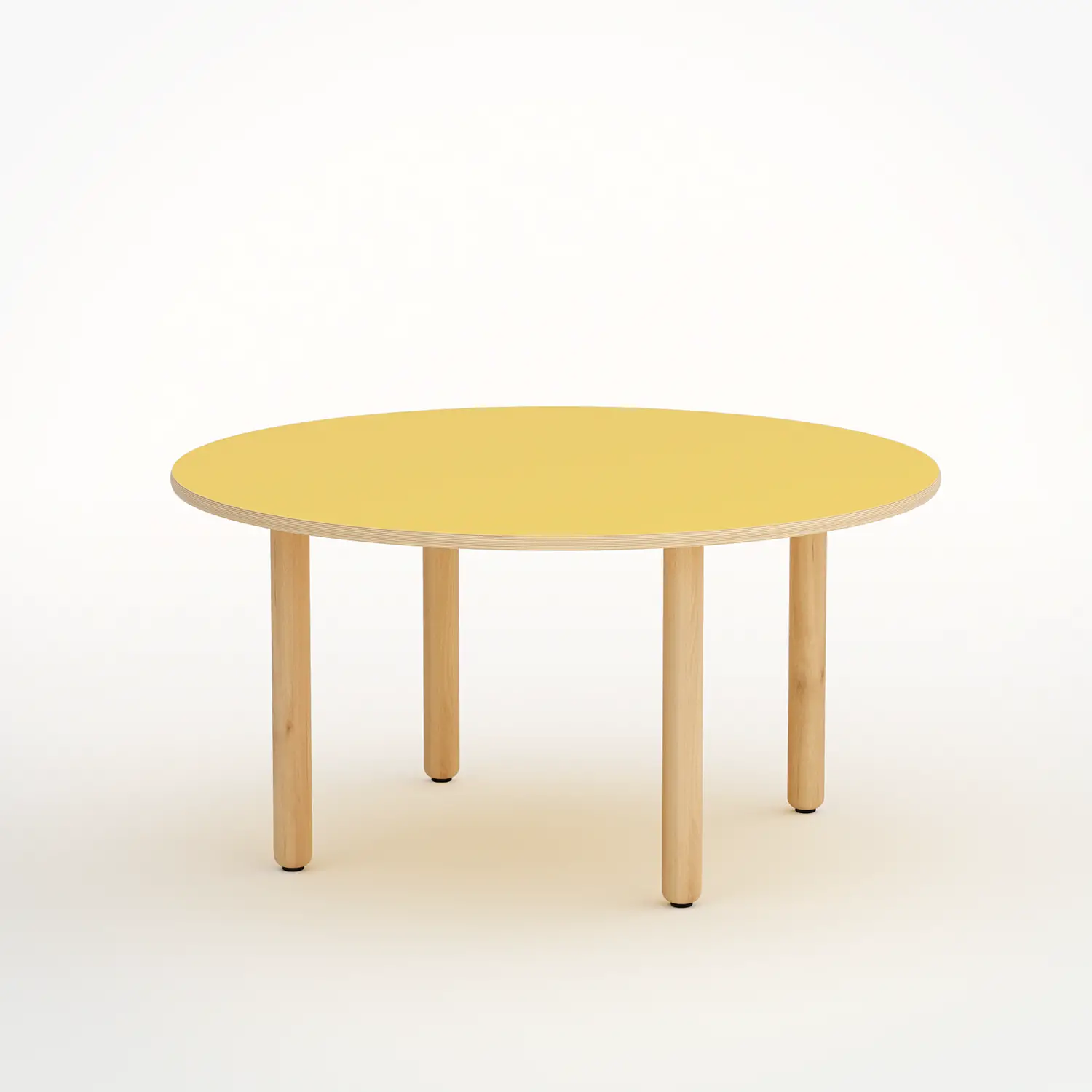 Piano in multistrato di betulla da 22 mm placcato con bilaminato plastico colorato -spessore 0,7 mm - antiriflesso, antigraffio e lavabile.Bordo arrotondato, finitura con vernice trasparente atossica.Gambe in faggio massello ø 60 mm verniciate al naturale con vernice trasparente atossica all’acqua e gommini antisdrucciolo. Si assicurano sotto il piano mediante esclusiva piastra in polipropilene a doppio incastro.La particolare sagoma a “onda” permette di accostare l’uno agli altri i vari tavoli per realizzare infinite composizioni e sfruttare così al meglio gli spazi a disposizione.Gli spigoli, i bordi e le forme arrotondate, sono stati studiati per evitare traumi in caso di urti accidentali.Conforme UNI EN 1729Dimensioni: cm ø 120 - h 58 cm (misura 3)