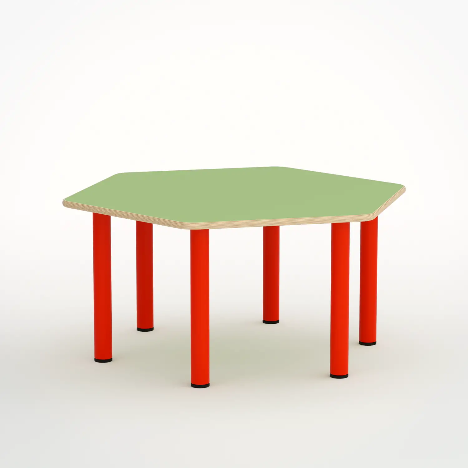 22 mm birch plywood top plated with 0.7 mm colroated plastic laminate, anti-reflective, scratch-resistant and washable.Rounded anti-shock edge with transparent finish painted with non-toxic water-based colors.Tubular metal legs ø 60 mm, painted lobster red color, with adjustable feet in anti-slip rubber.Rounded edges and corners to avoid trauma in case of accidental bumps.Supplied in kit with easy-to-assemble legs.Dimensions: 113x130 cm (65 cm side) - h 52 cm (size 2)