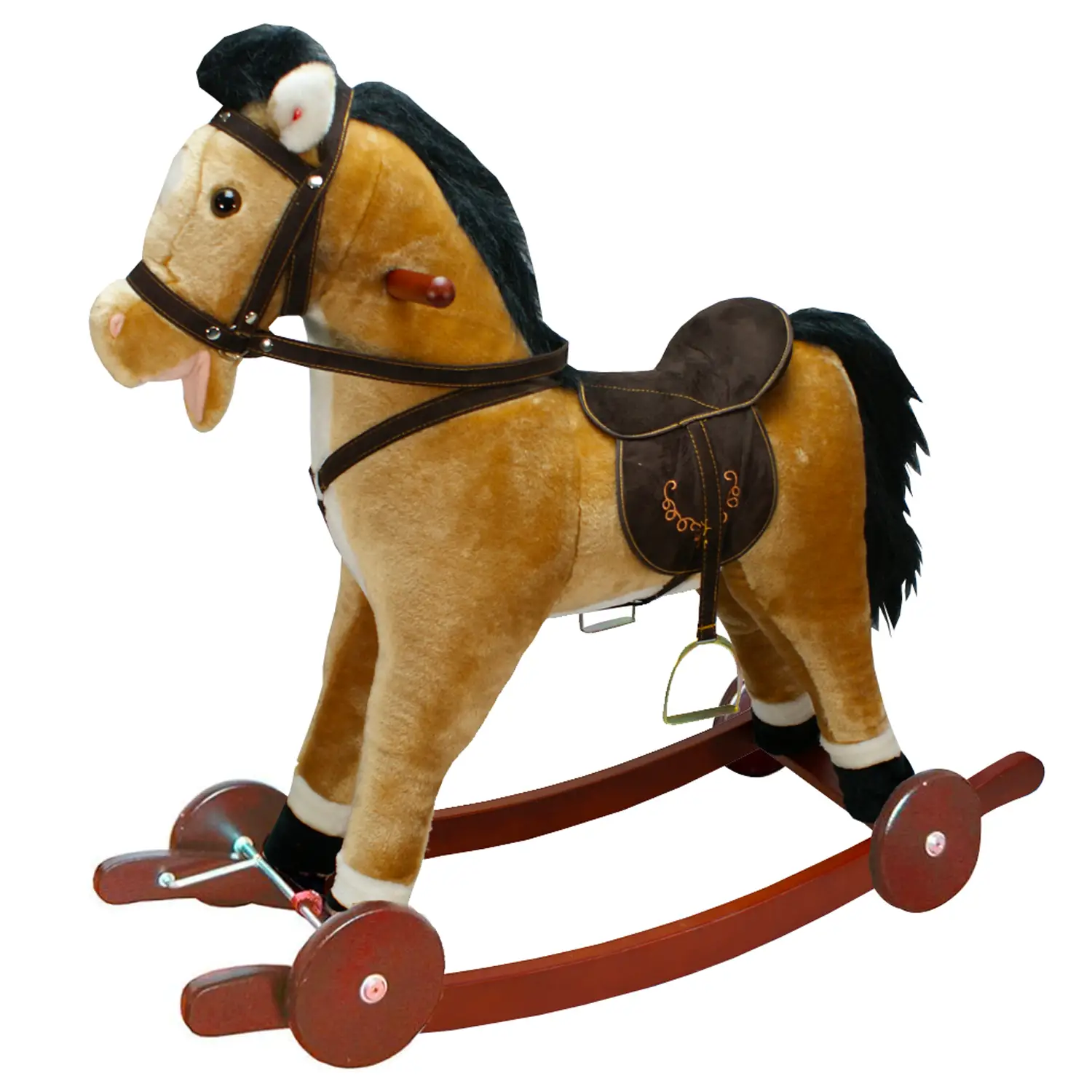 Light Brown Large Rocking Horse, Plush Rideable Horse with Wheels, Nitrisce and Mouth Moves