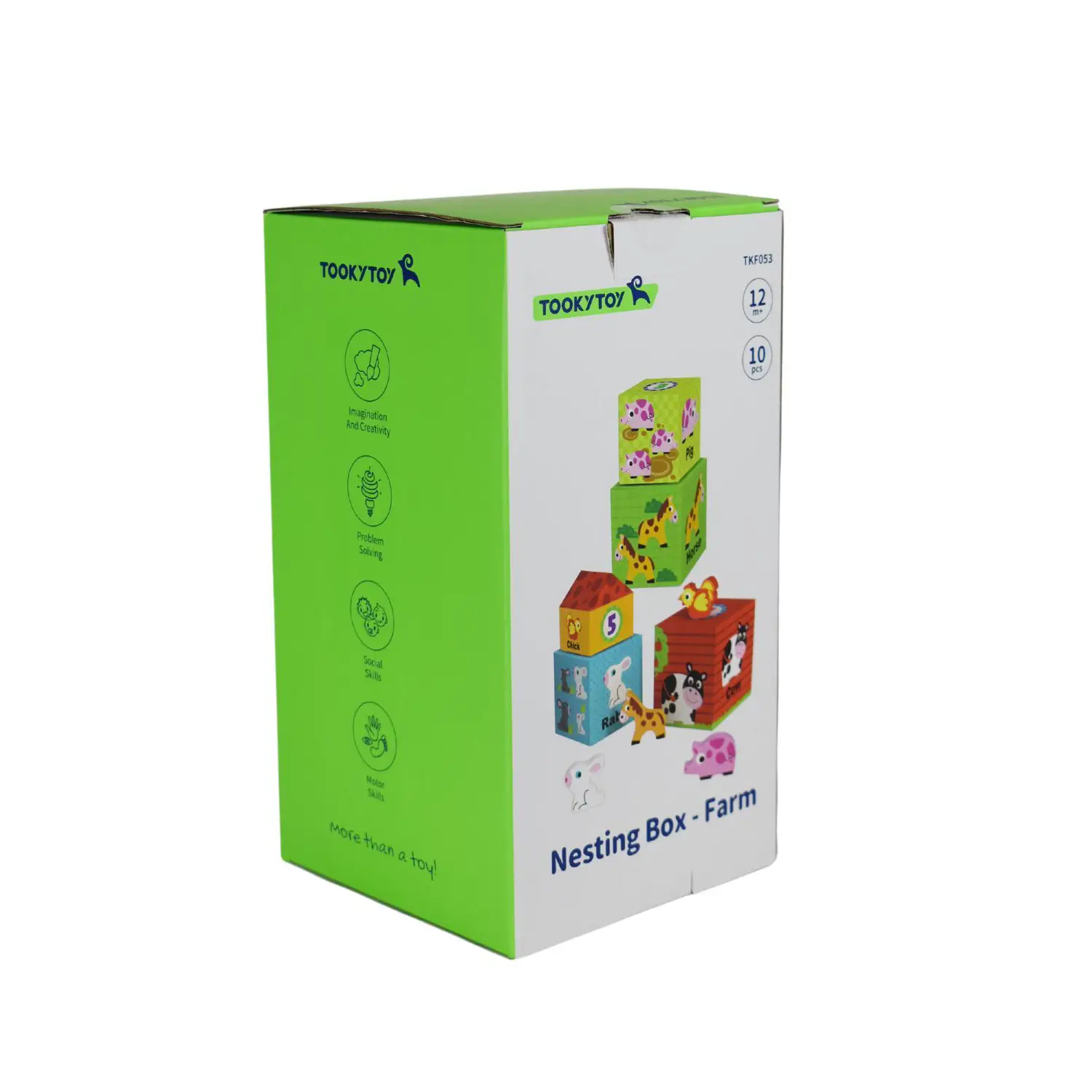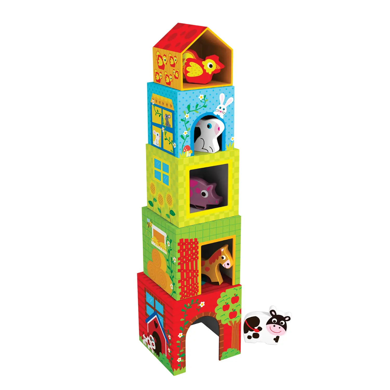 6 coloratissimi cubi numerati in ordine crescente, che fungono da tana per gli adorabili animali della fattoria, tutti in morbida plastica dipinti con colori vivaci: una mucca bianca e nera, un cavallo marrone, un cagnolino, una pecorella blu, un maiale rosa e una gallina gialla.