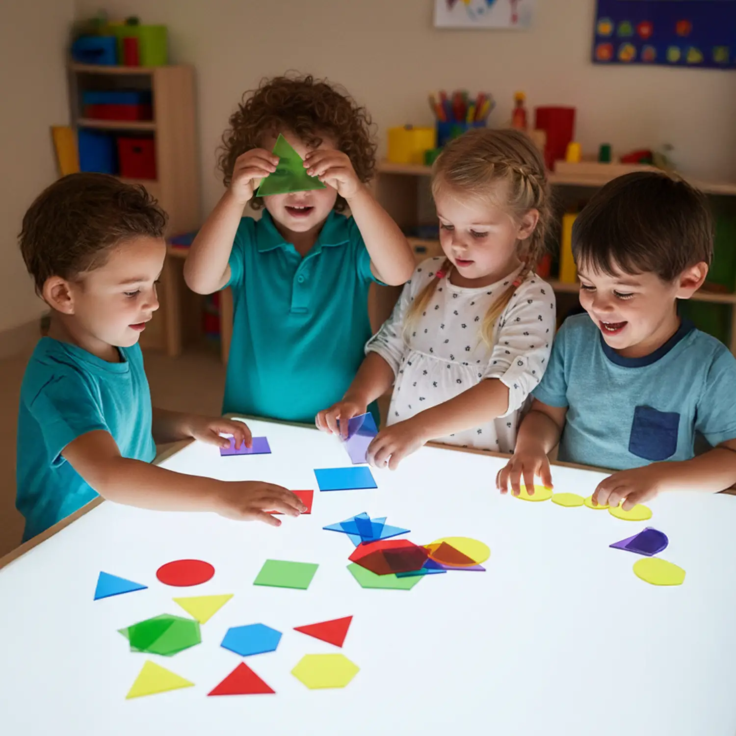 - ✅ 72 forme geometriche traslucide in 6 colori vivaci per attività didattiche.