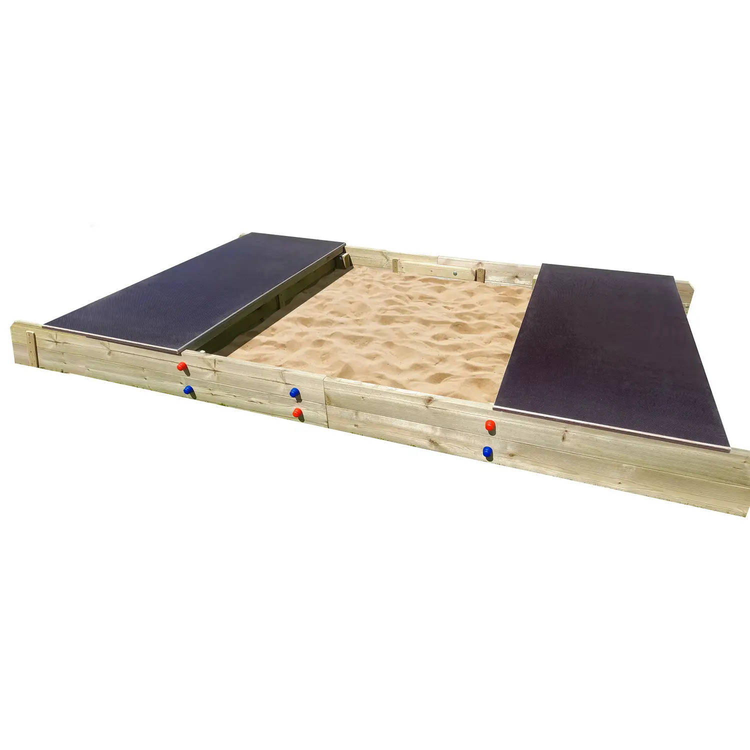Realizzata in legno di pino impregnato con coperchio a due pannelli scorrevoli in okumè marino tinto verde, la sabbiera è sicura anche per i bambini più piccoli, integrandosi armoniosamente con l’ambiente esterno.