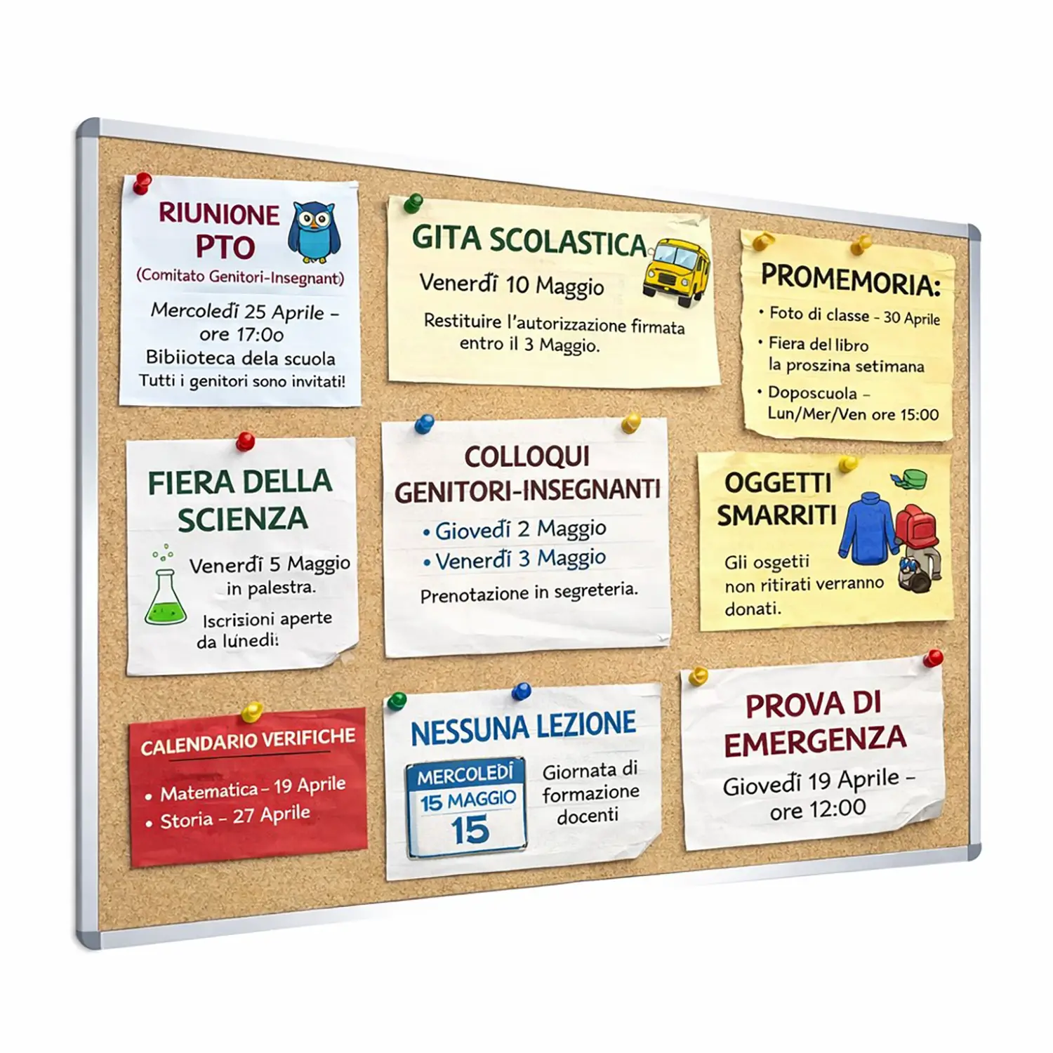 - Scuole: aule, corridoi e segreterie per affiggere compiti, verifiche e note informative