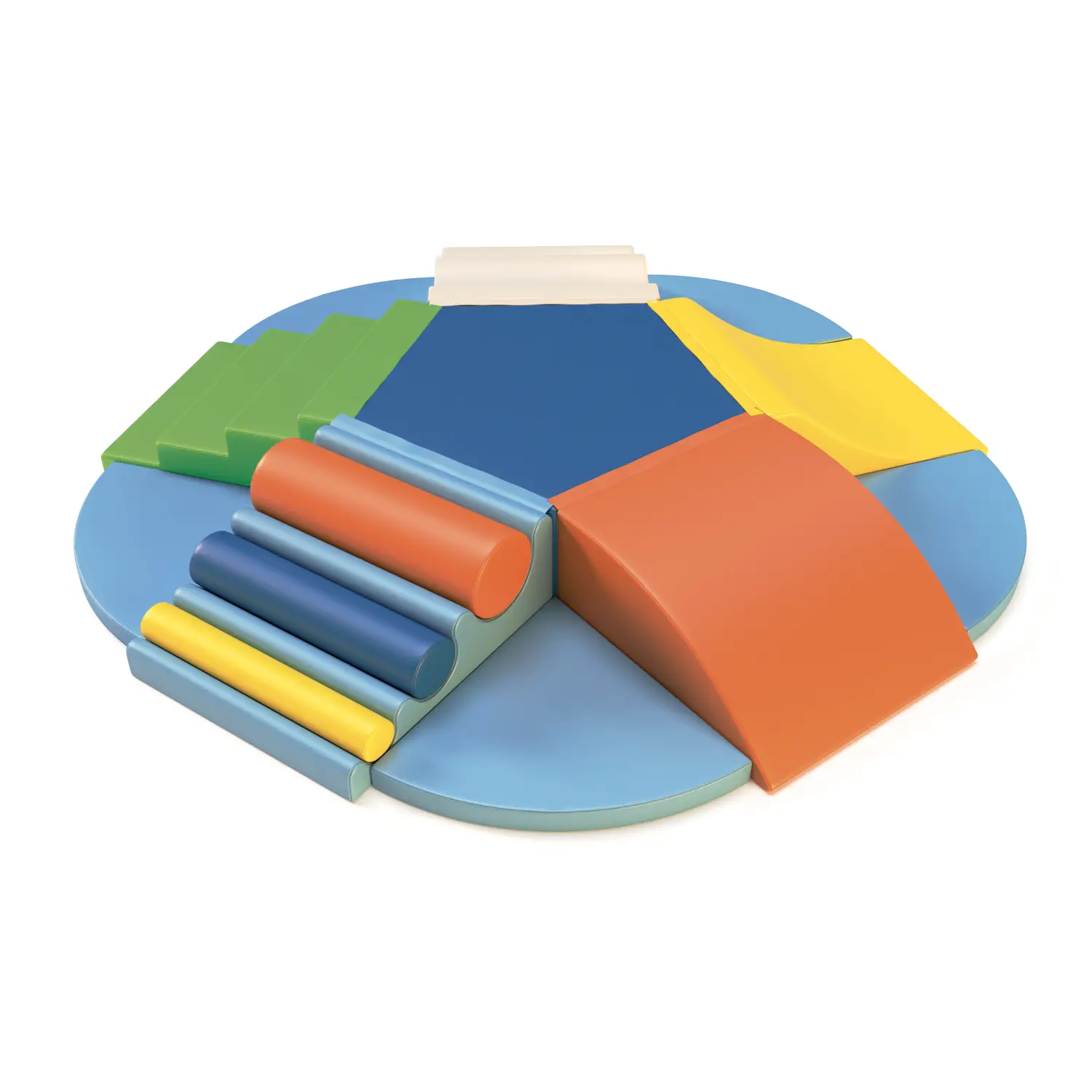 Composizione: - 5 Tappetini angolari 72° - 1 Base Penta - 5 Moduli: scala, onda, scivolo, rulli, pendio