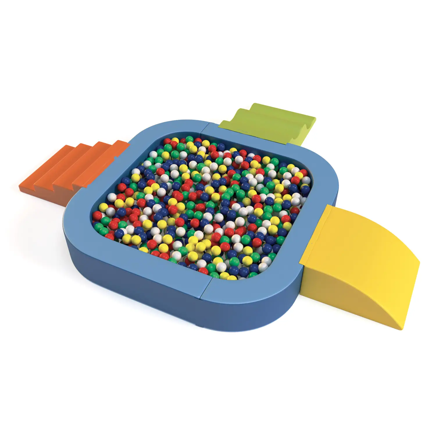 The structure consists of 2 bank elements that can be anchored to each other by Velcro-type straps, bottom sheet and cover sheet. About 1,000 balls (not included, art.5285.99) are needed to fill the Baby Mare. All Baby Paths elements (not included) can be attached to the pool, which are secured to it by means of special Velcro-type straps with cover flaps.