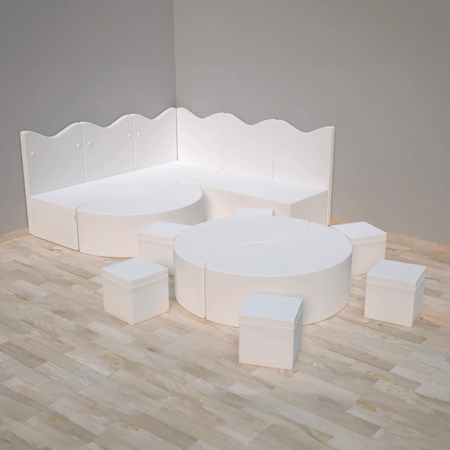 Grazie alla sua struttura componibile e all’altezza uniforme di 35,5 cm, il set permette una perfetta combinazione degli elementi, favorendo la creazione di ambienti versatili che si adattano alle esigenze educative e terapeutiche. Il rivestimento in PVC bianco è morbido, resistente, privo di ftalati e facile da igienizzare, rendendolo adatto all’uso quotidiano da parte dei più piccoli.