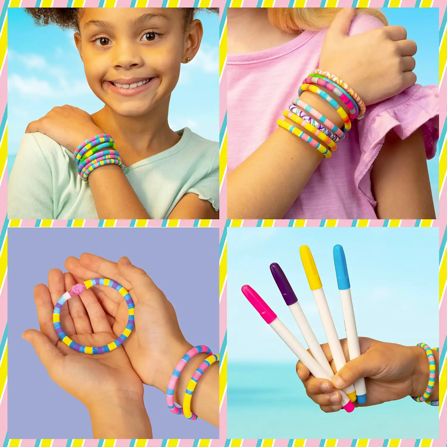 Kit completo per 15 braccialetti DIY Include 15 tubi, 15 chiusure e 4 pennarelli permanenti per personalizzare fino a 15 braccialetti colorati. Un set creativo completo che offre libertà totale di stile e fantasia.