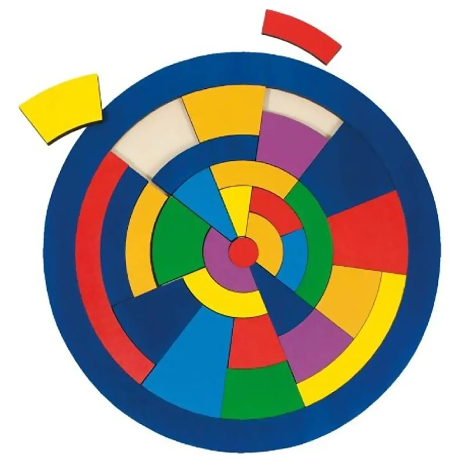 Realizzato interamente in legno di alta qualità, il puzzle offre una cornice solida in cui i bambini possono organizzare con cura i settori di diverse misure e sfumature. Quando assemblati correttamente, questi pezzi formano stupendi cerchi concentrici multicolore.