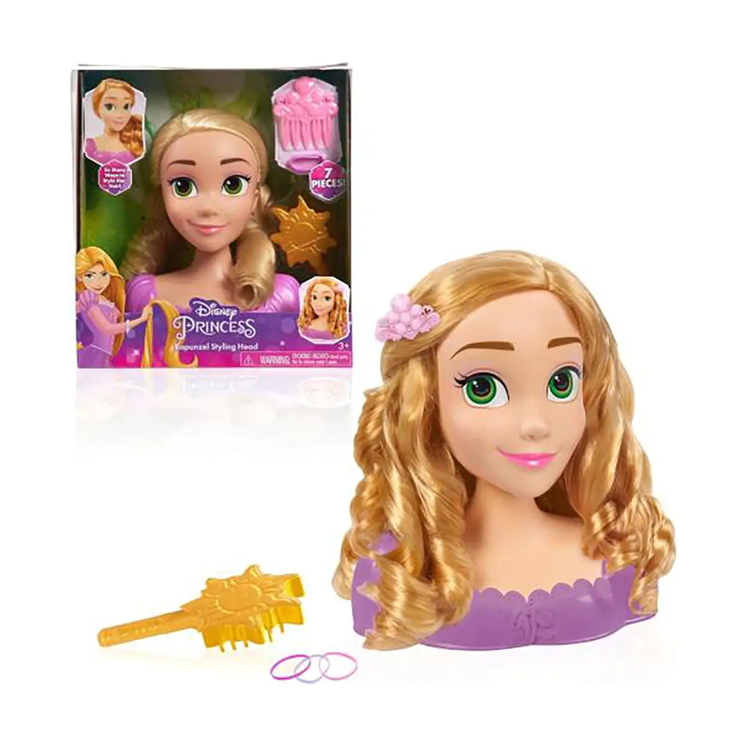 - ✅ Disney Rapunzel combing head with brush, comb and 4 rubber bands included.