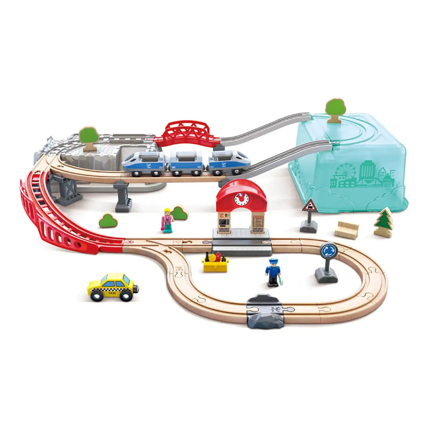 - ✅ Set ferroviario in legno da 48 pezzi con gru magnetica e motore a batteria per un'esperienza realistica.