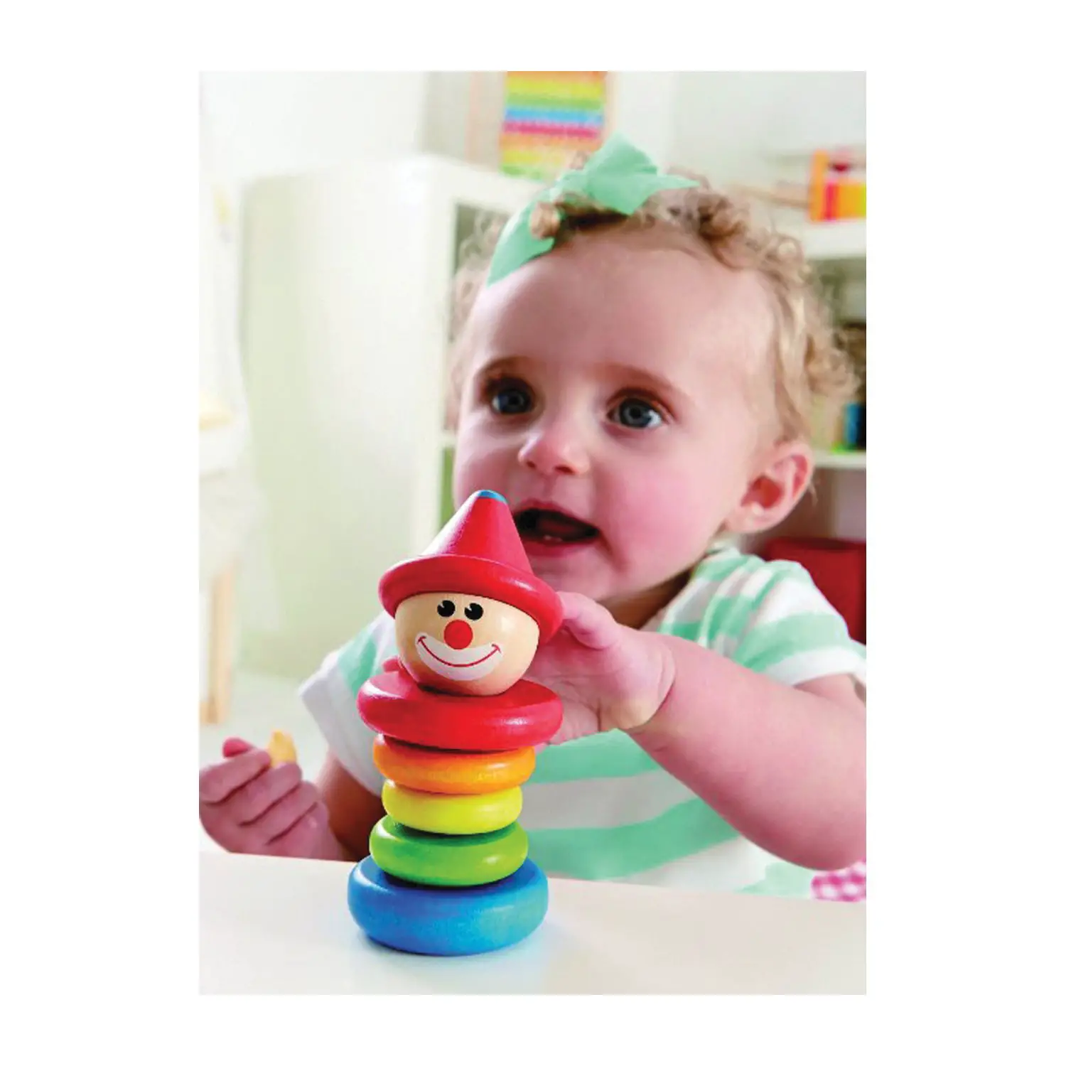 Il sonaglino prende vita tra le mani del bambino grazie all’elastico interno, stimolando curiosità e percezioni.