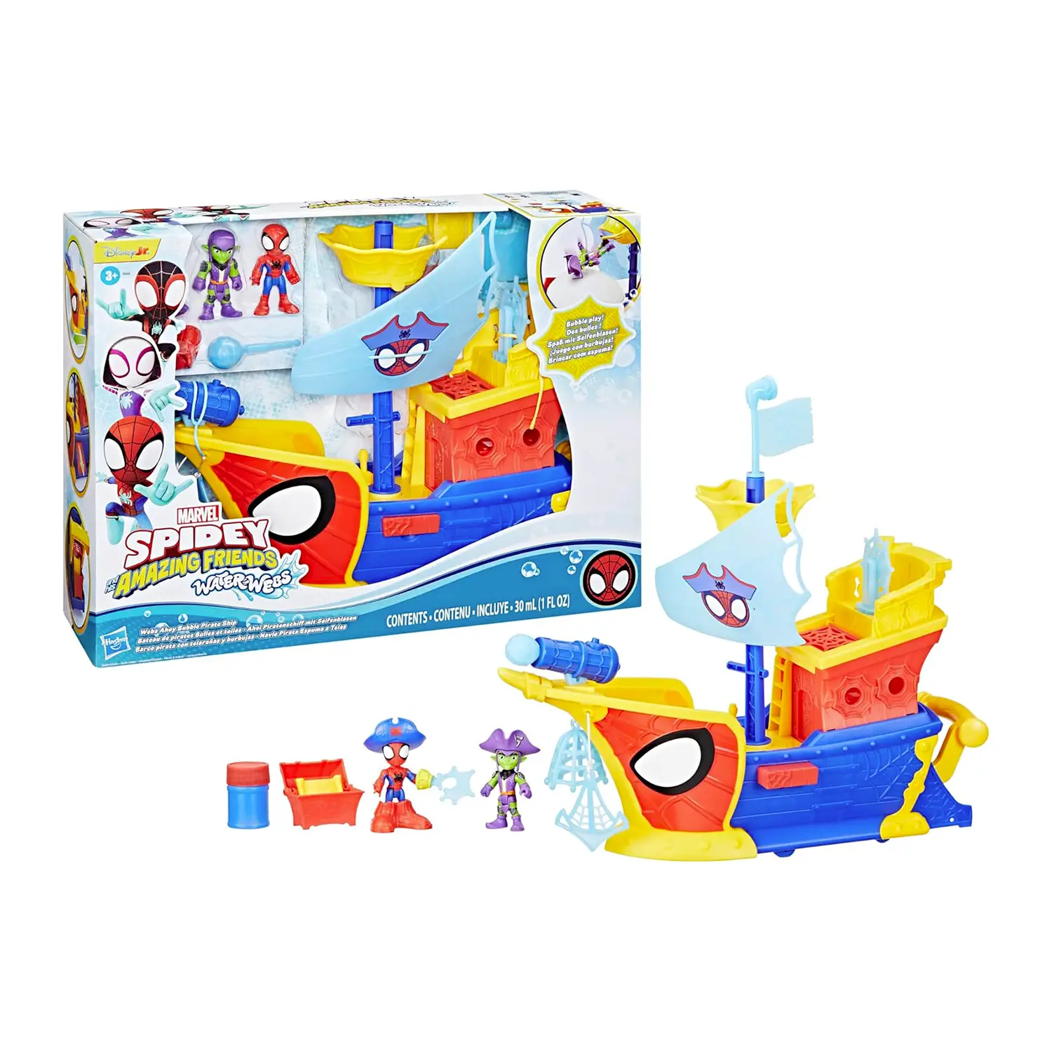 Playset Spidey pirati 43 cm - Il playset Spidey a tema pirati da 43,1 cm offre avventure marine con 2 action figure, una nave estendibile e 9 accessori. Perfetto per giochi immaginativi, stimola creatività, gioco simbolico e storytelling tra bambini fan di Spider-Man.