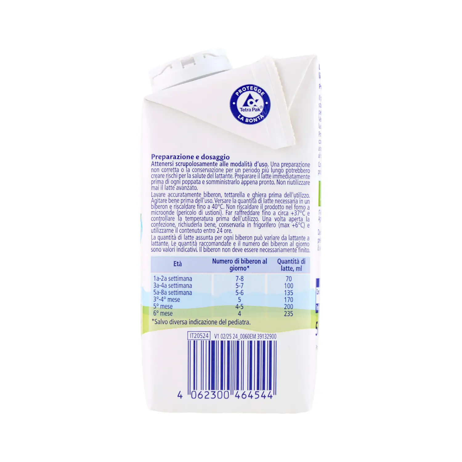 Latte Pronto All’Uso e Sicuro La confezione liquida garantisce la massima igiene e facilità di preparazione. Basta agitare, versare nel biberon e scaldare fino a 40°C. Perfetto per l’uso a casa o fuori, senza necessità di misurini o diluizioni.