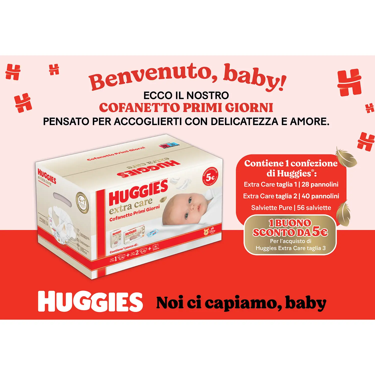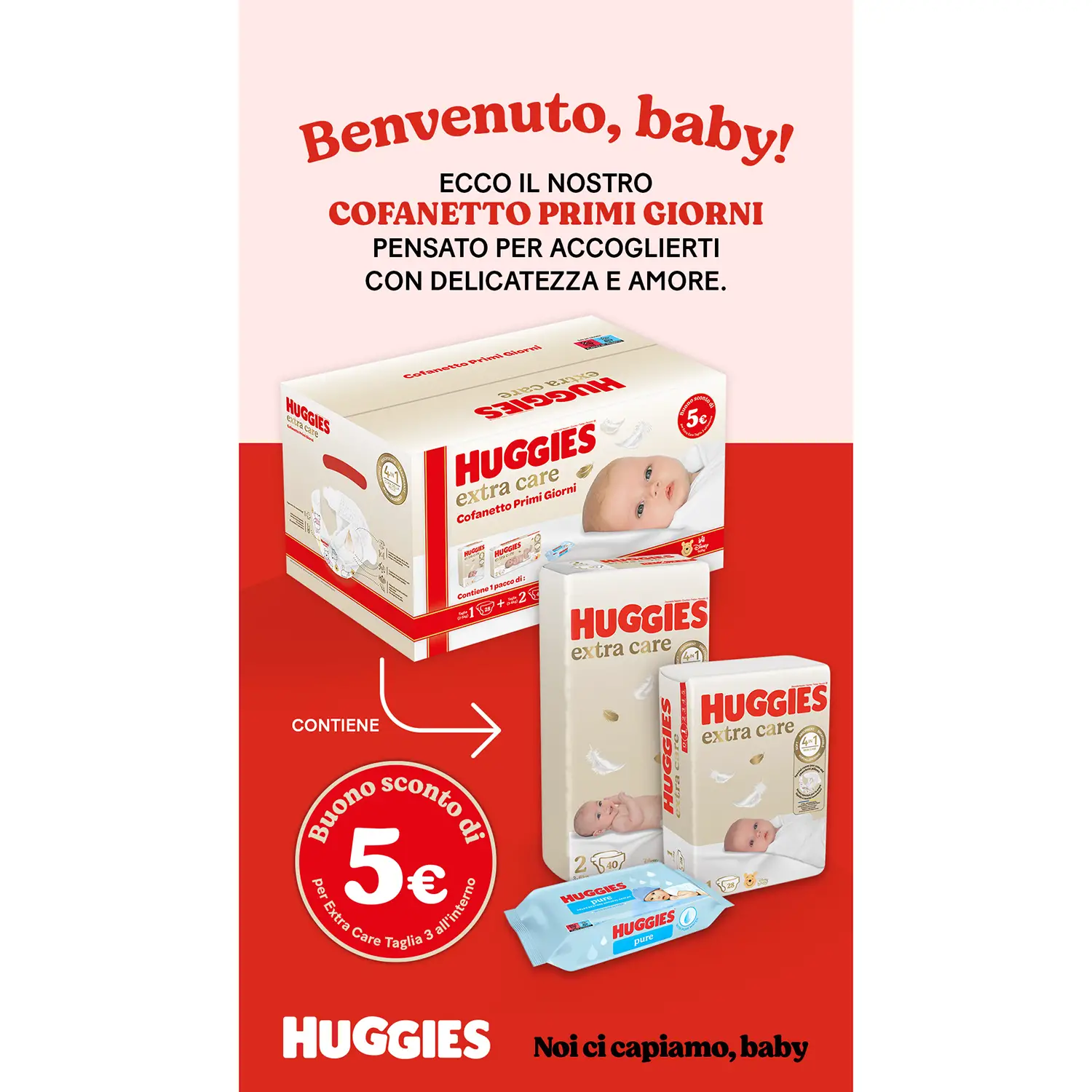 Bonus convenienza incluso – All’interno del cofanetto è presente un buono sconto da 5€ per l’acquisto di Huggies Extra Care Taglia 3, per continuare la cura del bambino con un vantaggio extra.