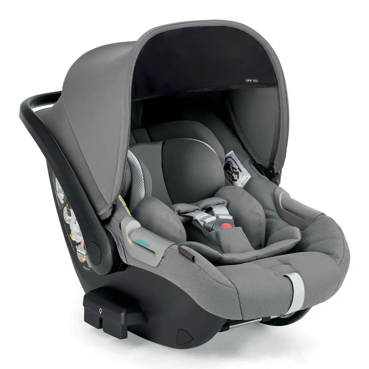 Seggiolino auto Darwin Infant i-Size Omologato ECE R129/03 (40–75 cm), garantisce massima sicurezza con Side Head Protection, 149 fori di ventilazione e capottina UPF50+. Installabile con o senza base, sempre contro marcia.