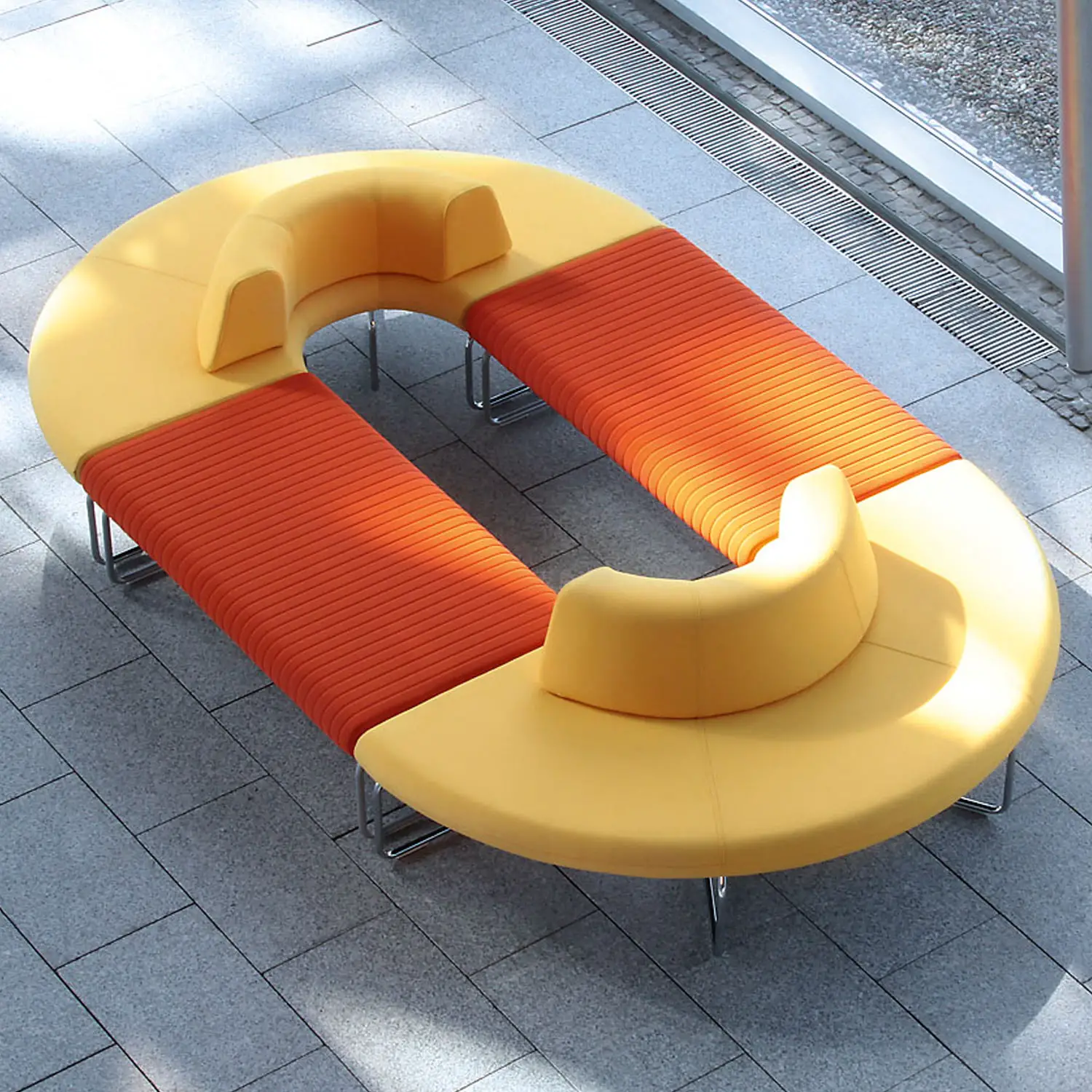 Includes 180° sofas in mustard yellow and backless sofas in orange for different seating options.