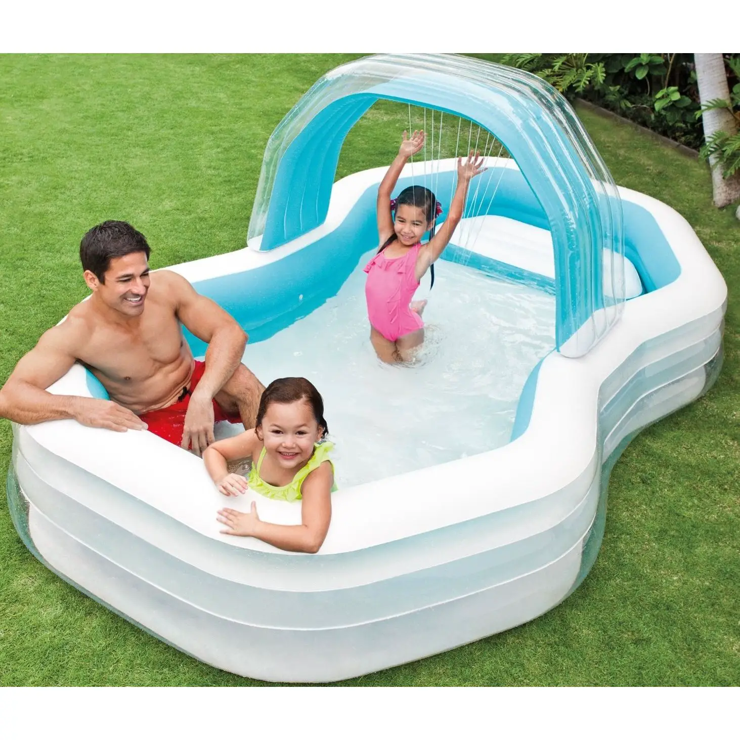 Piscina Family cabana 310 x 188 x 130 cm, capacità d'acqua 700 litri, livello suggerito di riempimento 28 cm, tappo di scarico acqua, con sedile gonfiabile incorporato per maggiore comfort, arco removibile spruzza acqua collegandolo alla canna da giardino, età anni 3+