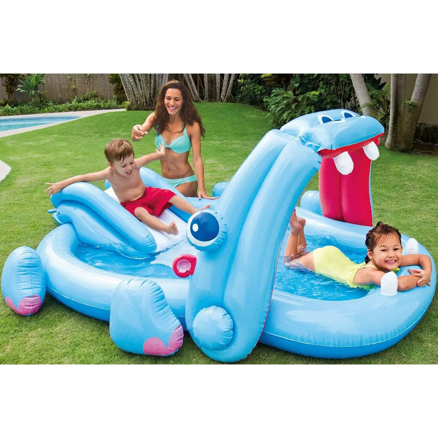 Playcenter ippopotamo 221 x 188 x 86 cm, con mini scivolo gonfiabile, portata massima 81 kg, spruzzo d’acqua nebulizzato che funziona attaccandolo alla canna da giardino, tappo di scarico acqua, capacità d’acqua 227 litri, livello suggerito di riempimento 15 cm, età anni 3+