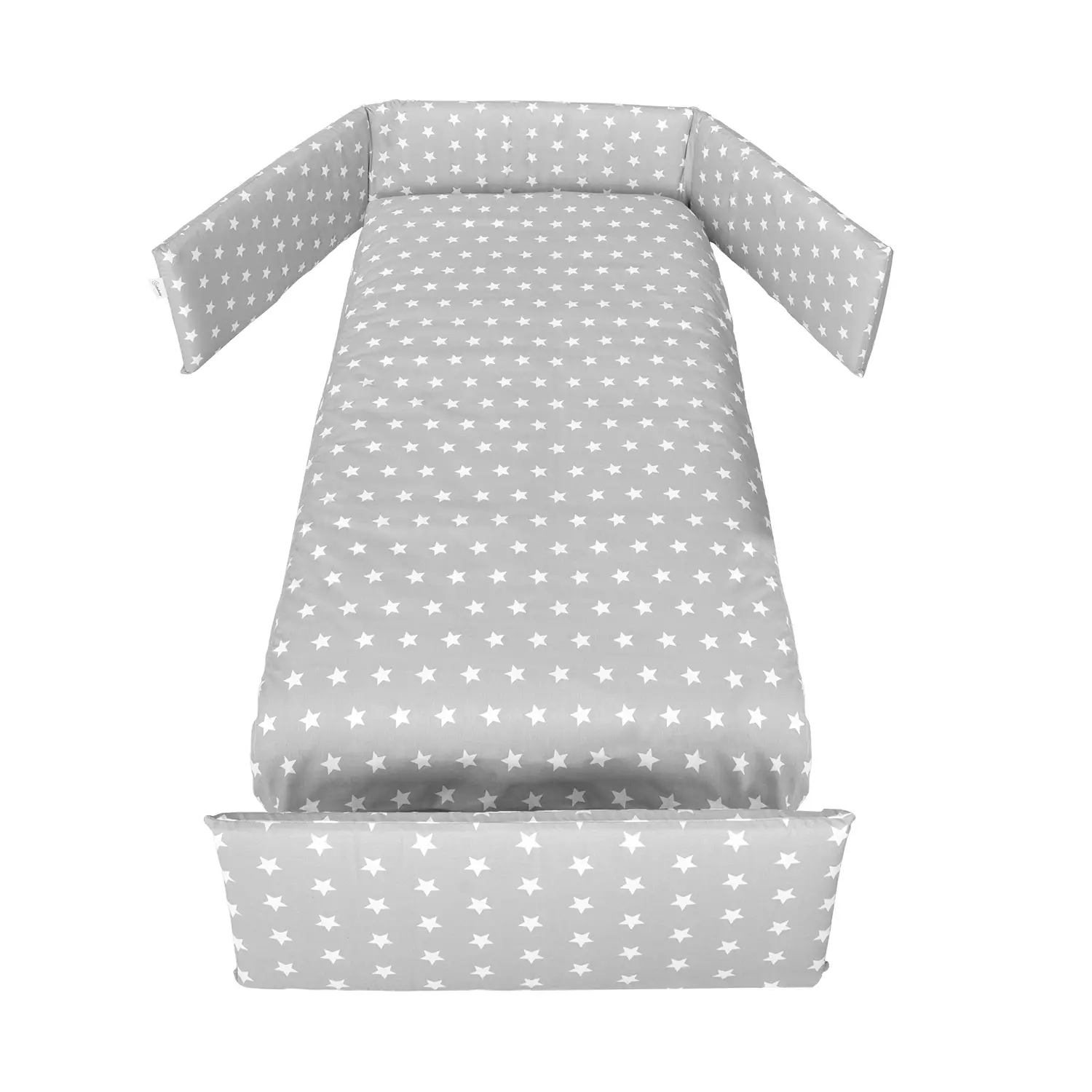 Paracolpi Modulabile per Sicurezza e Stile Il paracolpi modulabile incluso nel set si adatta perfettamente dalla culla al lettino, garantendo la sicurezza del tuo bambino durante il sonno. Coordinato con il tema Starlette Grigio, il paracolpi aggiunge un tocco decorativo e di protezione alla testiera del letto.