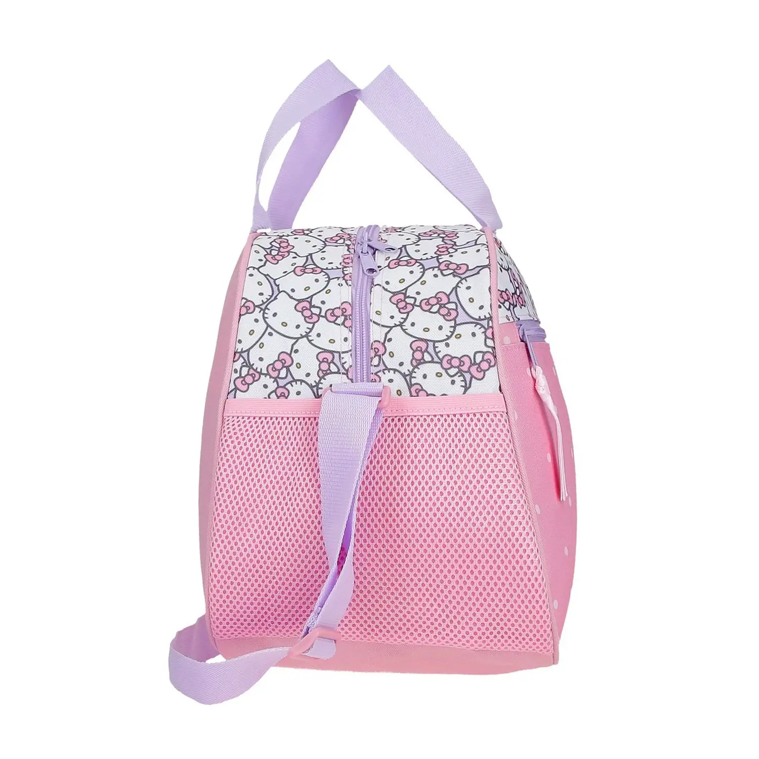 Tasche Laterali Funzionali Dotata di due tasche laterali pratiche per riporre piccoli oggetti, bottiglie o accessori, mantenendo tutto organizzato e facilmente accessibile. Perfetta come borsone viaggio Hello Kitty multifunzione.