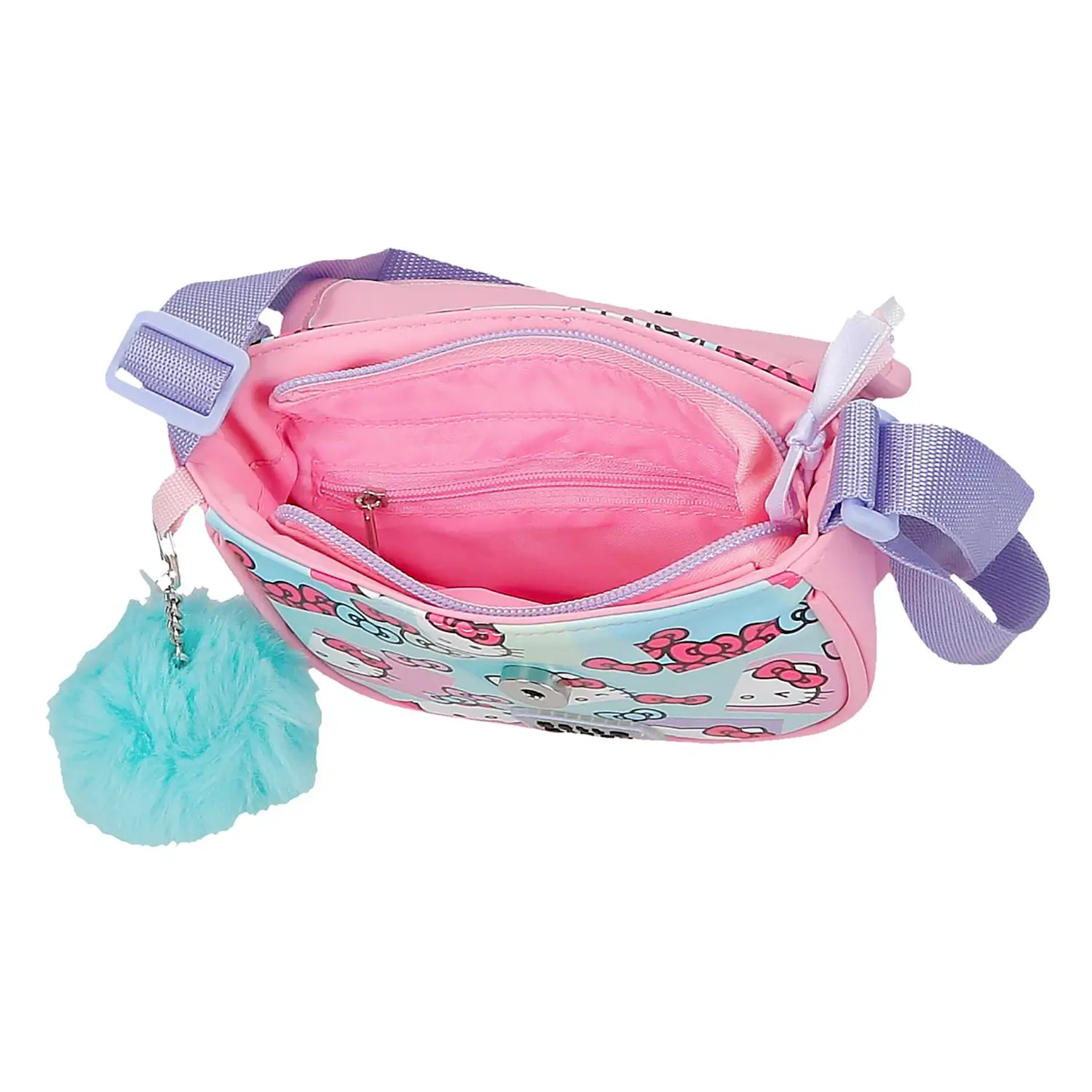 Dettagli moda con pompon decorativo Completa di morbido pompon azzurro removibile e logo Hello Kitty ben visibile. Un dettaglio trendy che rende questa mini bag un’idea regalo perfetta per fan del brand e amanti dello stile kawaii.