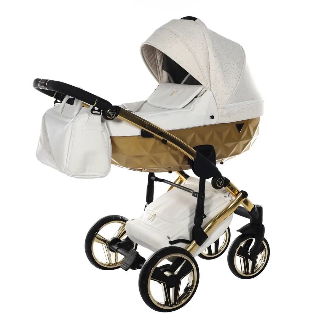 - Cappottina in tessuto e finiture in ecopelle, conferendo al passeggino un aspetto lussuoso.