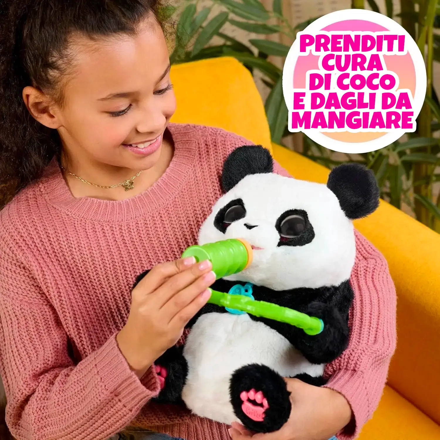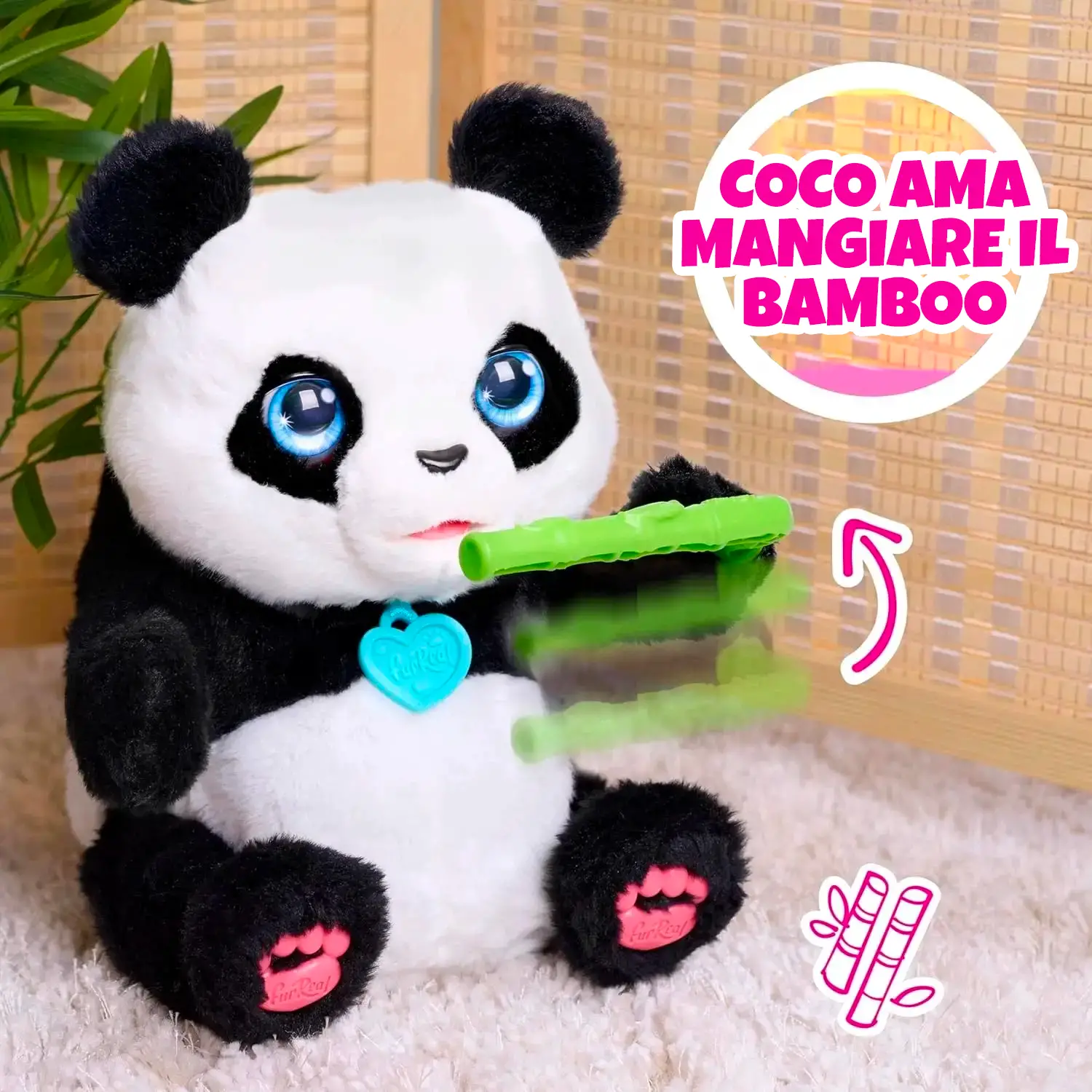 Beve e Sgranocchia come un Vero Panda Quando Coco ha fame, basta inserire il suo biberon per sentirla bere oppure avvicinare il germoglio di bambù al musetto per ascoltare i simpatici suoni dello spuntino.