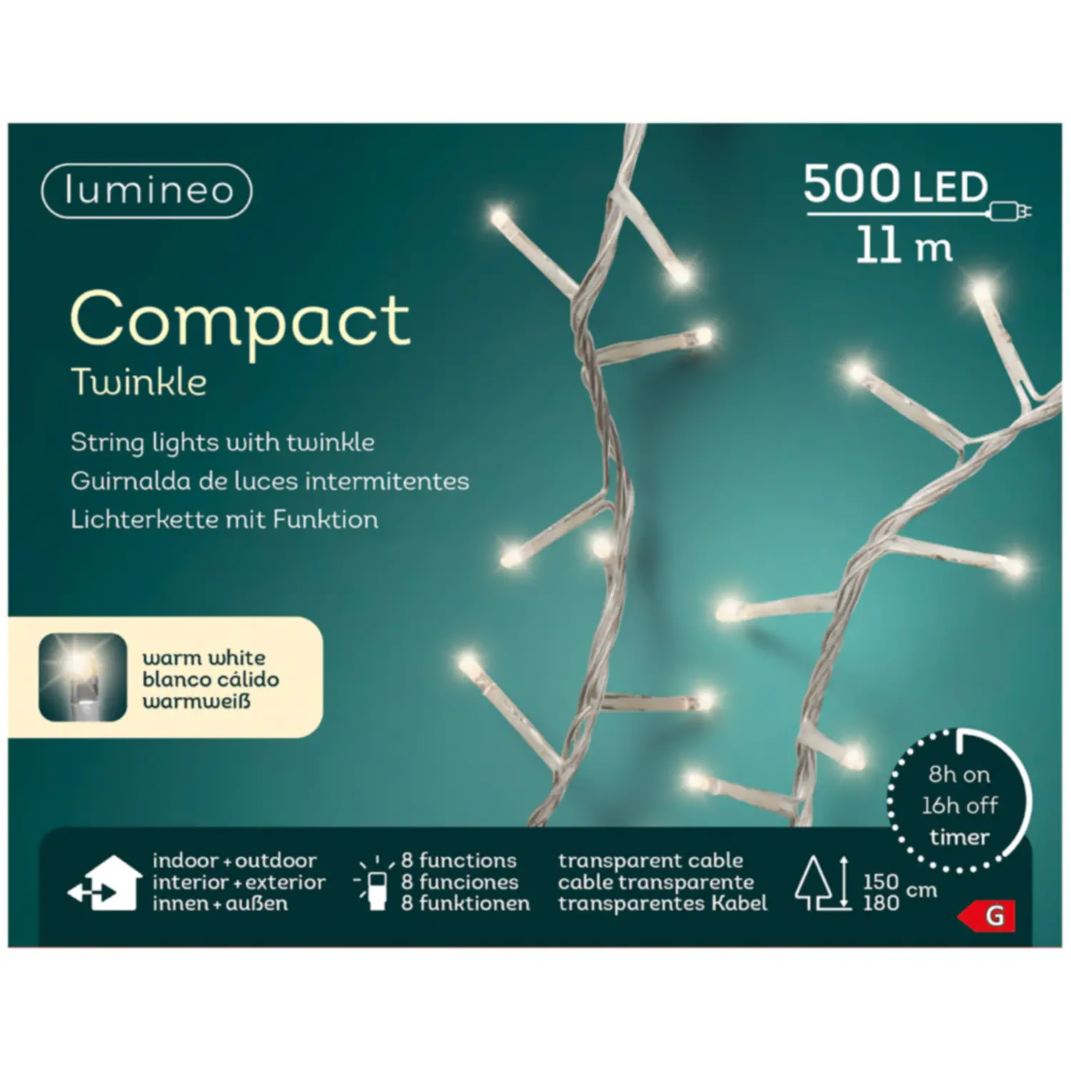 Luci di Natale Lumineo Compact Twinkle – 500 LED Bianco Caldo – Filo Trasparente da 11 Metri