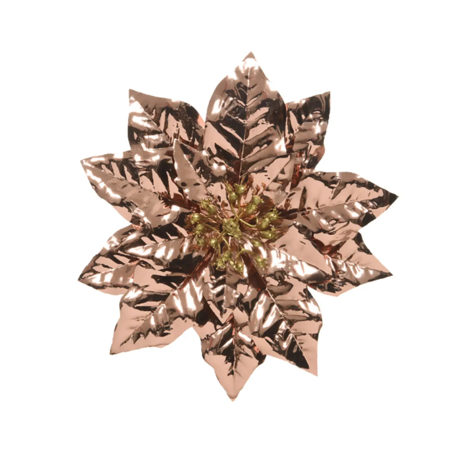 La poinsettia, simbolo intramontabile del Natale, è proposta in rame lucido, creando un effetto elegante e scintillante.